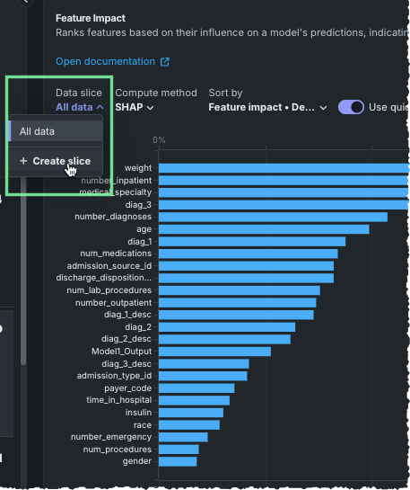 Slices are not available in projects created with SHAP Feature Importance and SHAP-based Prediction Explanations.