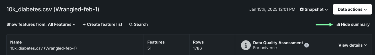 When exploring a dataset, click Show summary to view information, including feature and row count, as well as a Data Quality Assessment.