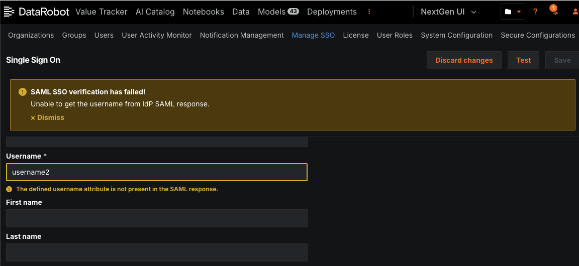 You can conduct automated testing for a SAML SSO connection after configuring it from the SSO management page. When you conduct a test, administrators provide the user credentials and perform the login process on the IdP side. When testing completes, you receive either a success message or a warning message about what went wrong, with fields highlighting the incorrect values.