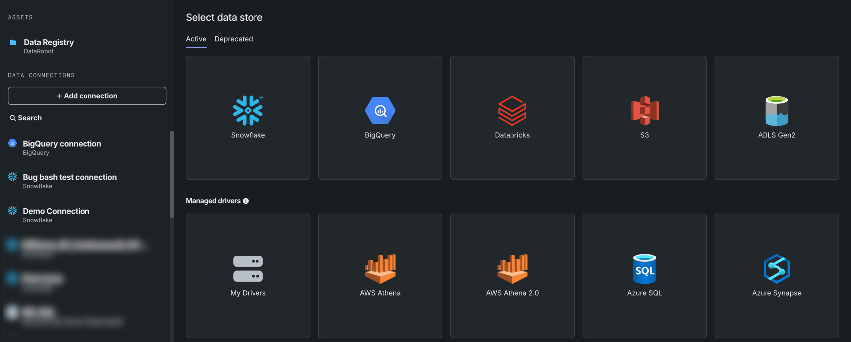 In Workbench, you can connect to and add snapshotted data from supported JDBC drivers. When adding data to a Use Case, JDBC drivers are now listed under available data stores.