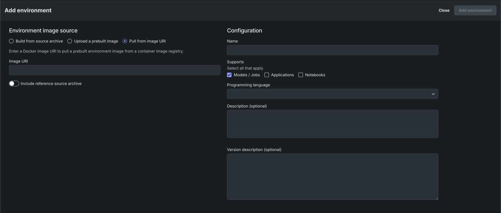 To add an execution environment, you can now provide a URI for an environment image published to an accessible container registry. Optionally, you can include the source archive used to build the image for reference purposes. This source archive is not used to build the environment.