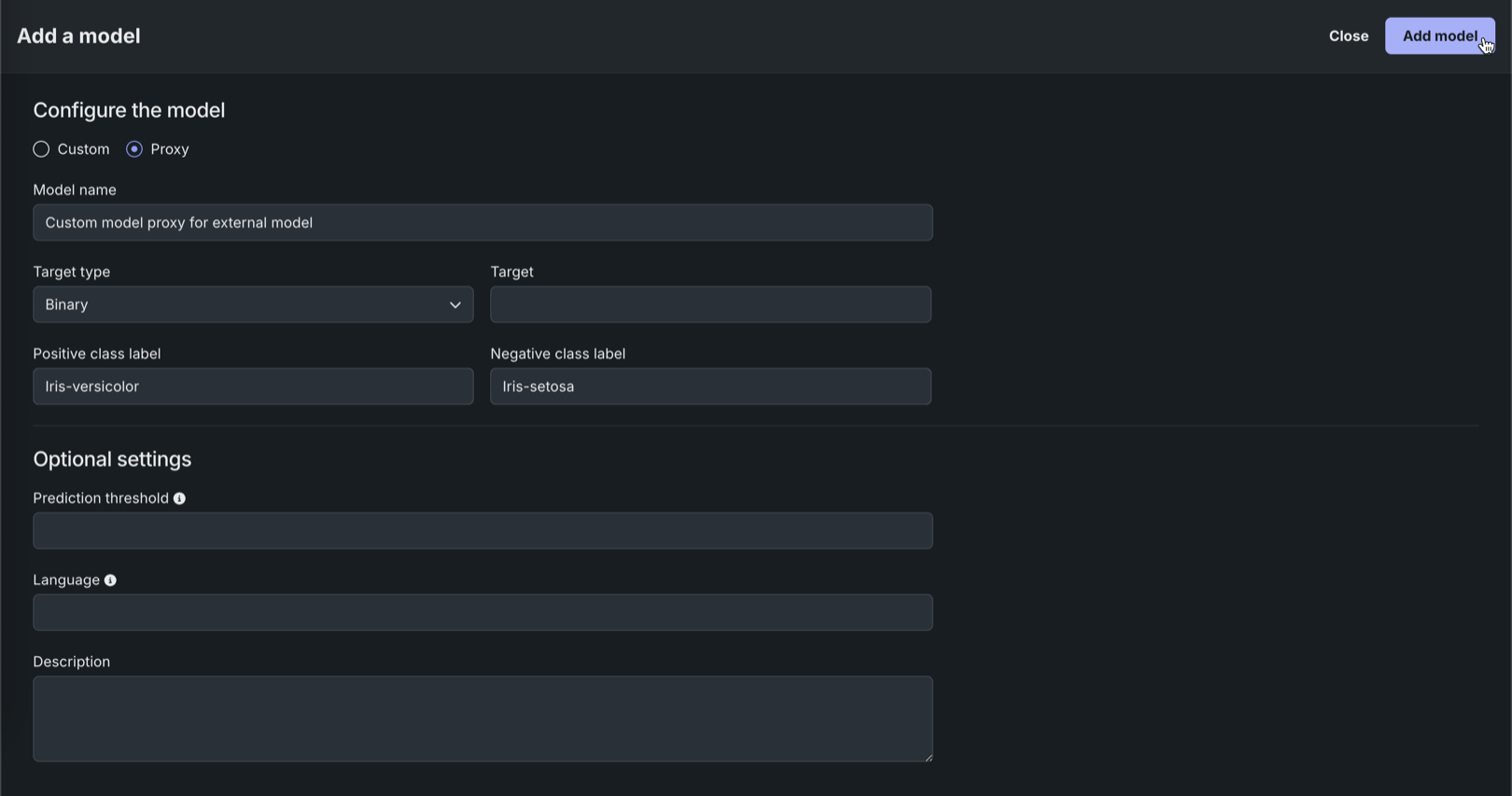 In the Registry workshop, you can create custom model as a proxy for an external model. A proxy model contains proxy code created to connect with an external model, allowing you to use features like compliance documentation, challenger analysis, and custom model tests with a model running on infrastructure outside DataRobot. For more information, see the documentation.