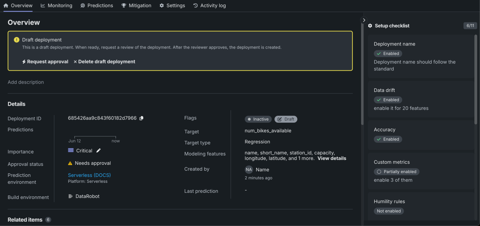 If a deployment is subject to a configured approval policy, the deployment is created as a draft deployment, as shown above. When a deployment is in the draft state, users can't make predictions, upload actuals or custom metric data, or create scheduled jobs. A deployment owner can request deployment approval on the deployment's overview page or the governance section of the deployment's activity log. After approval, the deployment is automatically moved out of the draft state and activated.