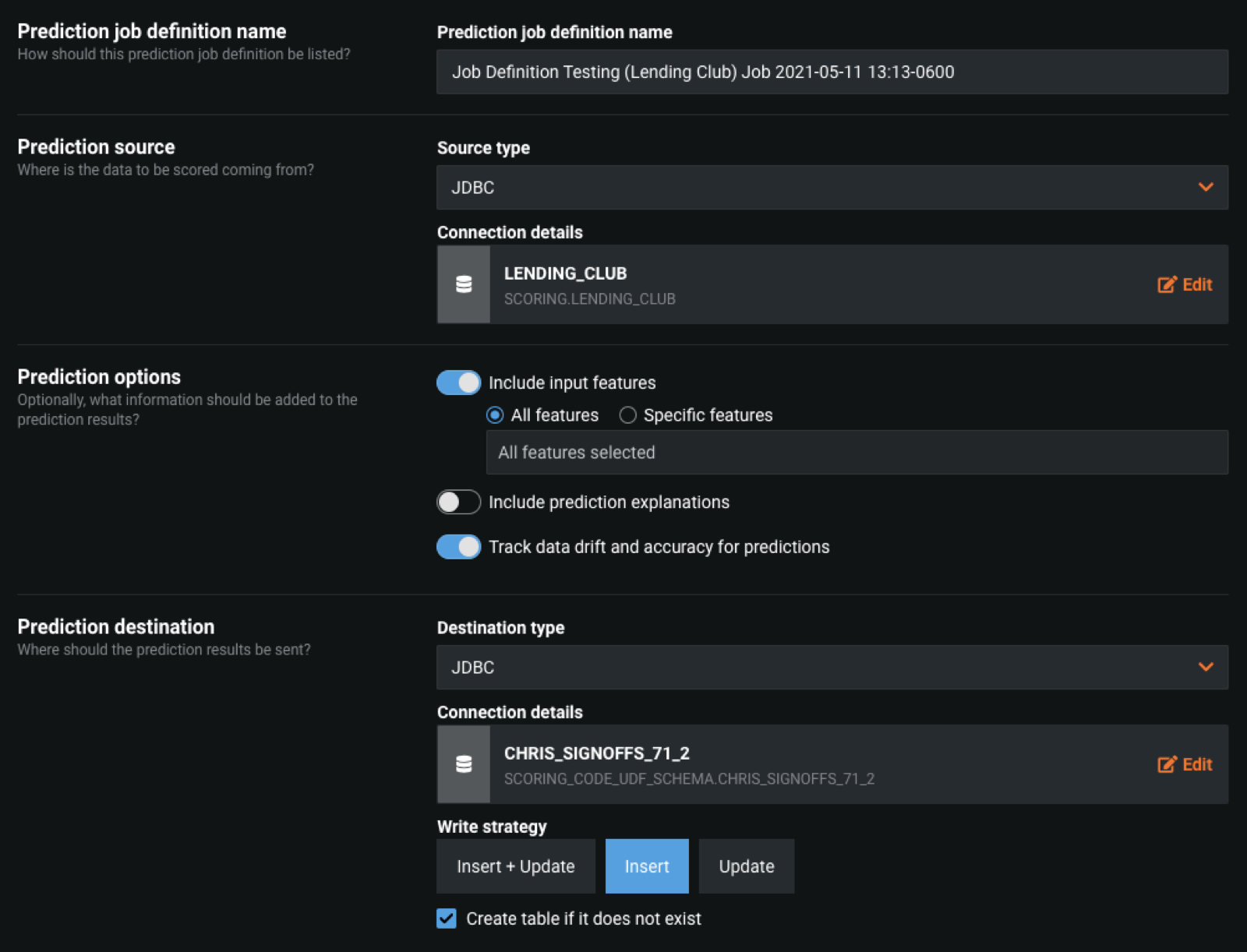 When making batch predictions for deployments via the Make Predictions tab, you can now create and schedule JDBC and cloud storage prediction jobs directly from the deployment without utilizing the API. Additionally, you can view a history of the prediction jobs that ran. Define the name of the job, the prediction source, configurations, and the prediction destination. All specifications are saved for later use.