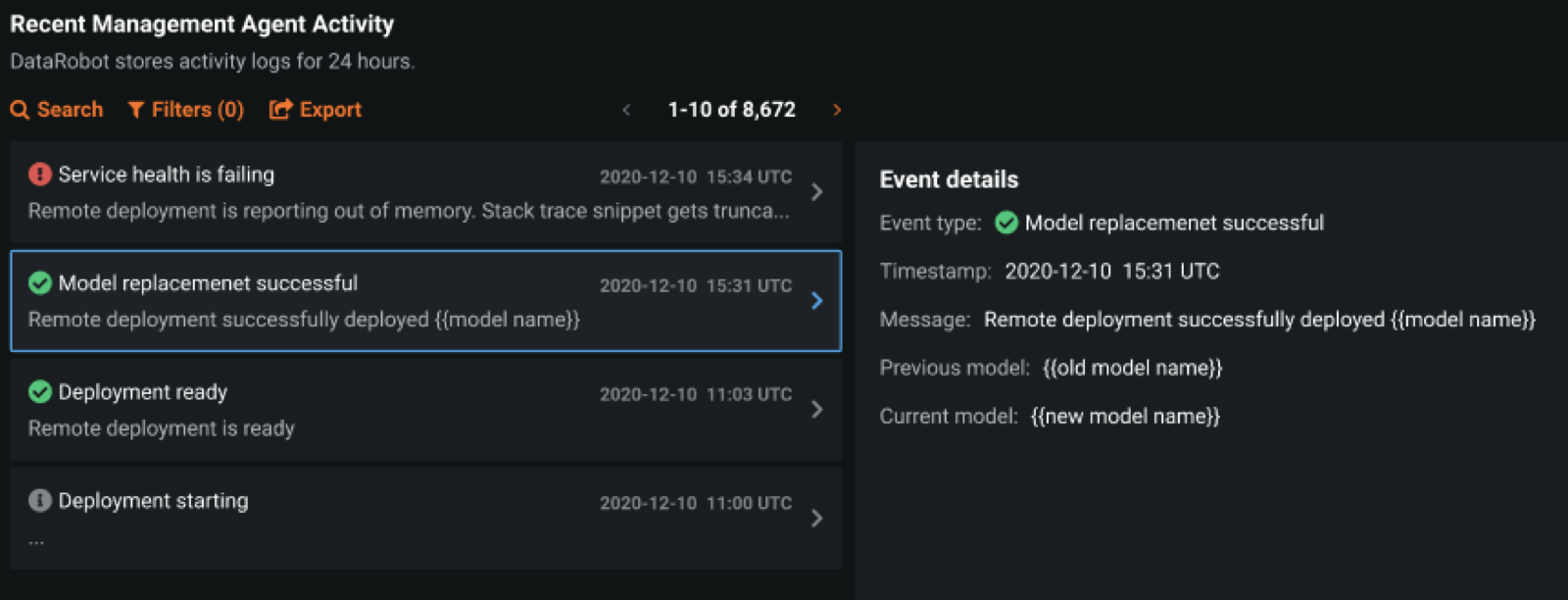 DataRobot is introducing the management agent, which understands the state of a deployment and can automate the task of retrieving artifacts, deploying models, and replacing them externally. The agent is extensible to support a variety of use cases in various model formats and prediction environments. Administrators can configure the management agent in their prediction environments to automate the deployment and replacement of models based on user actions within MLOps. It pairs easily with the MLOps Agent to automatically monitor models and integrate them with additional MLOps functionality such as challenger models. The management agent is a tool for standardizing and automating model deployment.
