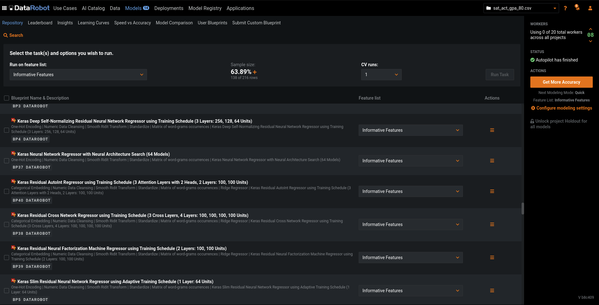 To support data scientists with CTR data (categoricals with high cardinality), DataRobot introduces three DeepCTR models, available from the Repository. These models—neural factorization machine, autoint, and deep cross network—can be particularly useful when building clickthrough rate or recommendation models.