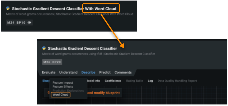 An improvement has been made so that all Stochastic Gradient Descent (SGD) blueprints create a Word Cloud if even a single text feature is present in a multiclass project. Previously, there was a specialized SGD blueprint, available from the Repository, that had to be run manually. Access the new visualizations from either the model’s Describe > Word Cloud or Insights > Word Cloud tabs.