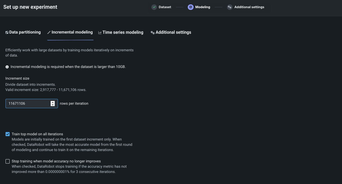 Available as a preview feature, you can now train models on up to 100GB of data using incremental learning (IL) for binary and regression project types. IL is a model training method specifically tailored for large datasets that chunks data and creates training iterations. Configuration options allow you to control whether a top model trains on one—or all—iterations and whether training stops if accuracy improvements plateau. After model building begins, you can compare trained iterations and optionally assign a different active version or continue training. The active iteration is the basis for other insights and is used for making predictions.