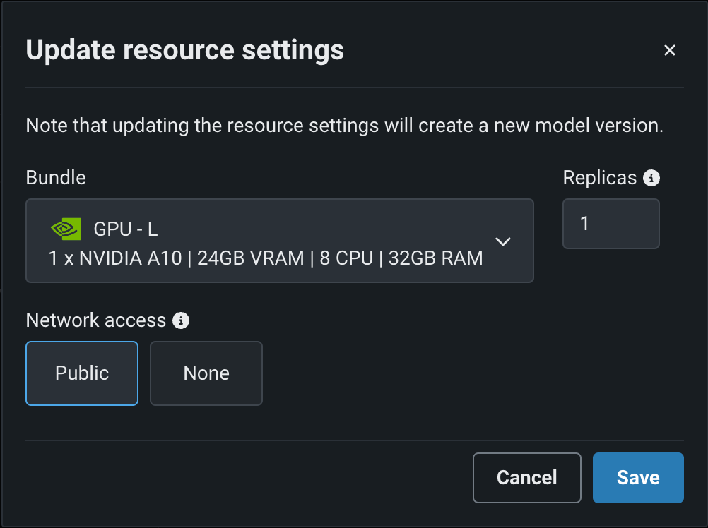 Select a Resource bundle—instead of Memory—when you assemble a model and configure the resource settings. Resource bundles allow you to choose from various CPU and GPU hardware platforms for building and testing custom models. In a custom model's Settings section, open the Resources settings to select a resource bundle. In this example, the model is built to be tested and deployed on an NVIDIA A10 device.