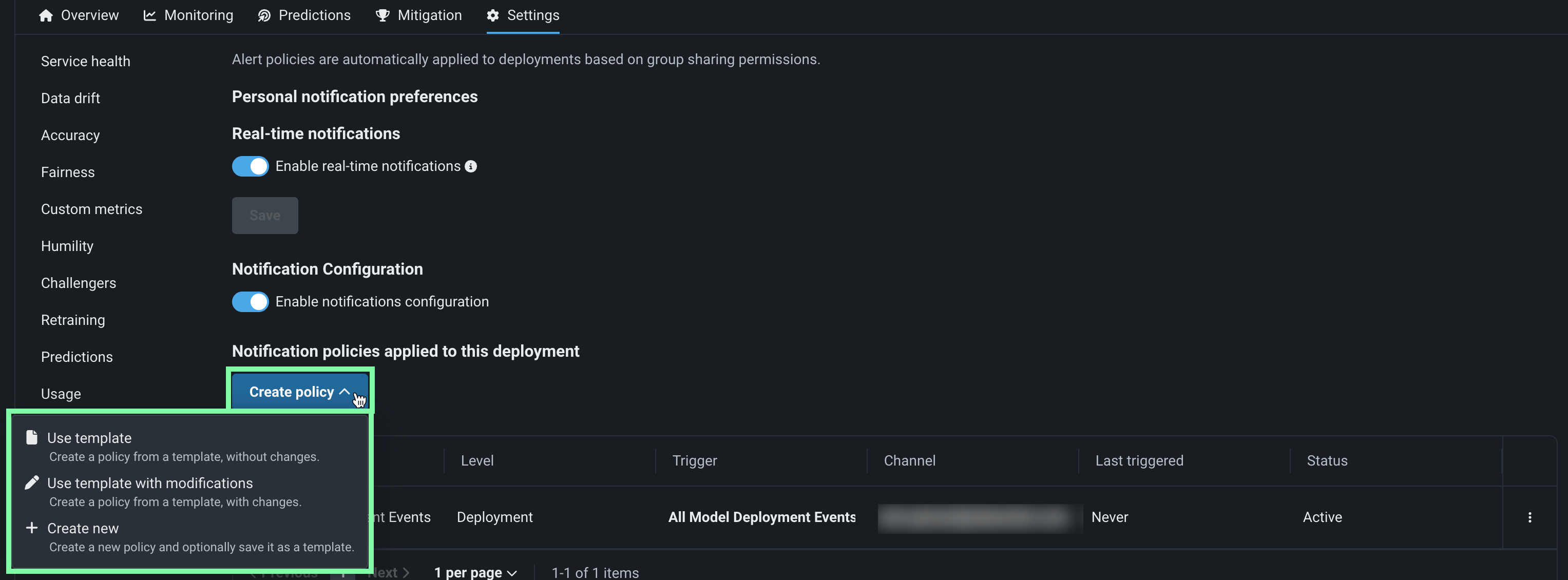Configure deployment notifications through the creation of notification policies, you can configure and combine notification channels and templates. The notification template determines which events trigger a notification, and the channel determines which users are notified. The available notification channel types are webhook, email, Slack, Microsoft Teams, User, Group, and Custom Job. When you create a notification policy for a deployment, you can use a policy template without changes or as the basis of a new policy with modifications. You can also create an entirely new notification policy: