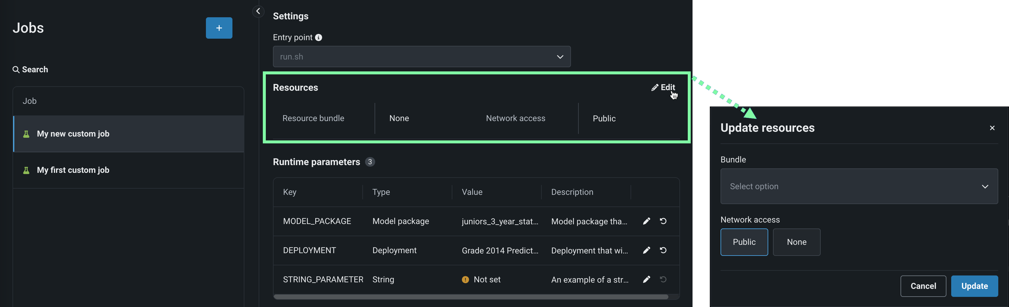 With this release, custom jobs include a Resources settings section where you can configure the resources the custom job uses to run and the egress traffic of the custom job: