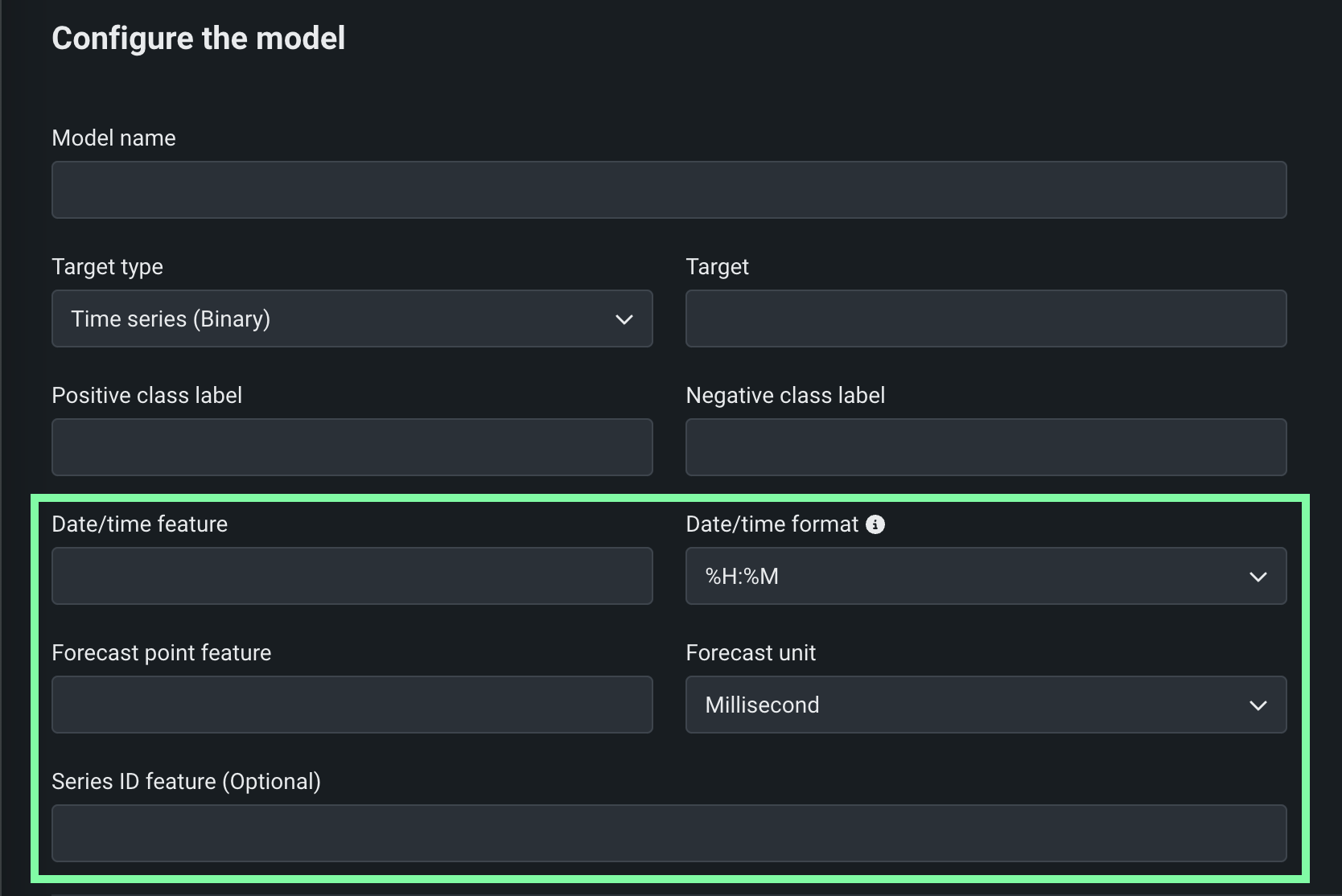 Create time series custom models by selecting Time Series (Binary) or Time Series (Regression) as a Target type and configuring time series-specific fields, in addition to the fields required for binary classification and regression models: