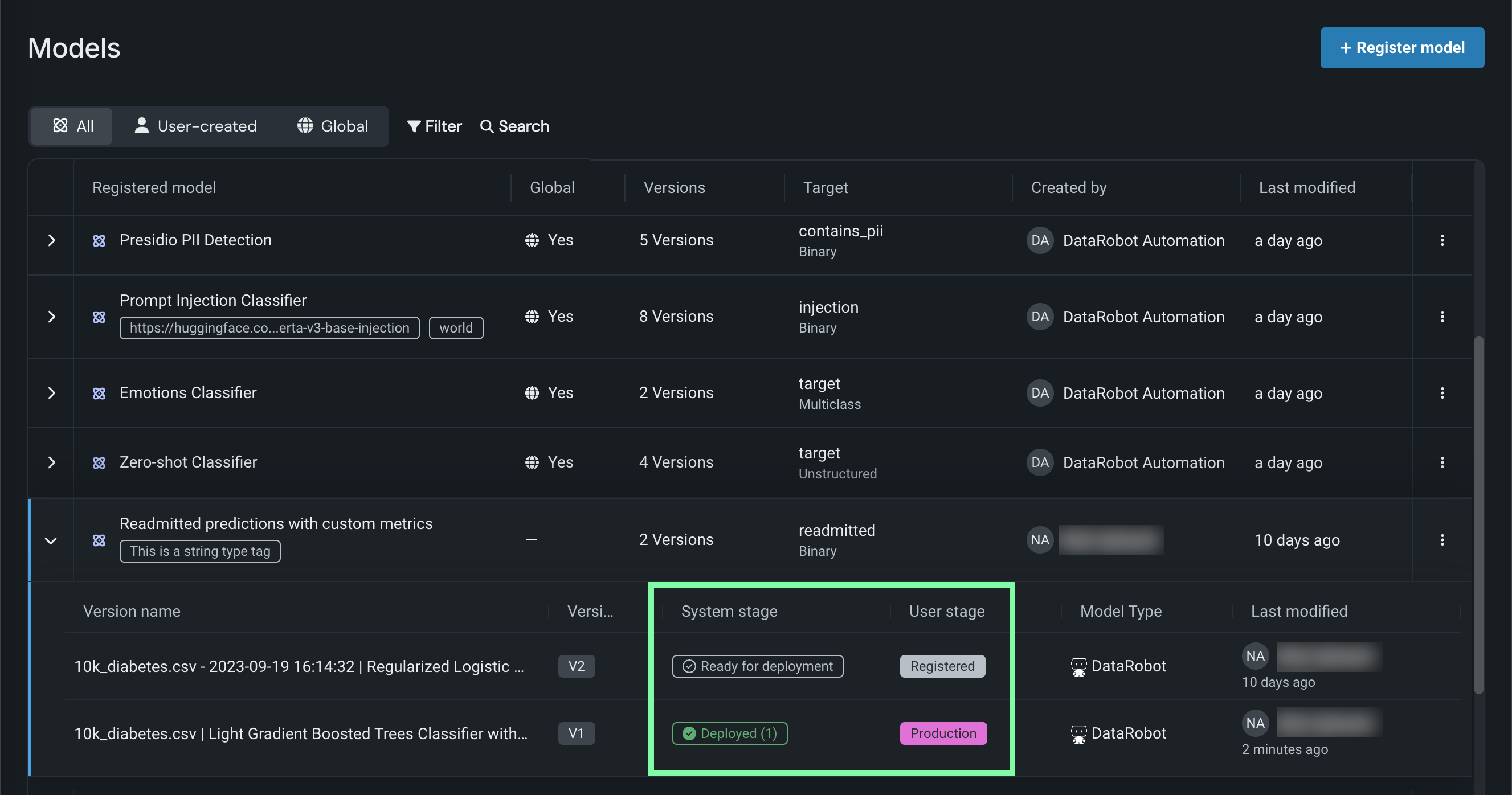 Now generally available in the NextGen Experience, Registry is an organizational hub for the variety of models used in DataRobot. The Registry > Models tab lists registered models, each containing deployment-ready model packages as versions. These registered models can contain DataRobot, custom, and external models as versions, allowing you to track the evolution of your predictive and generative models and providing centralized management: