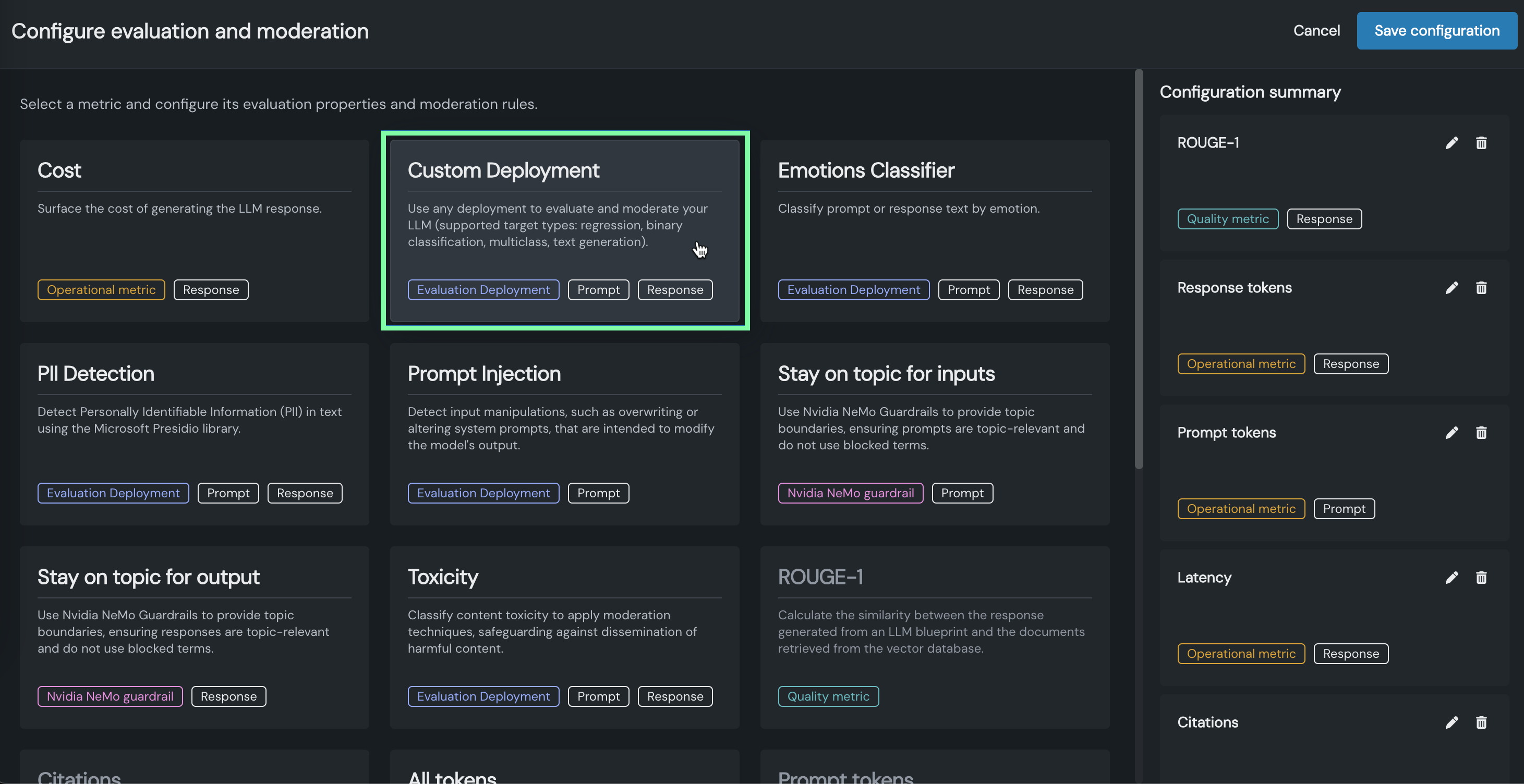 LLM evaluation and moderation metrics for LLM blueprints and deployments¶
