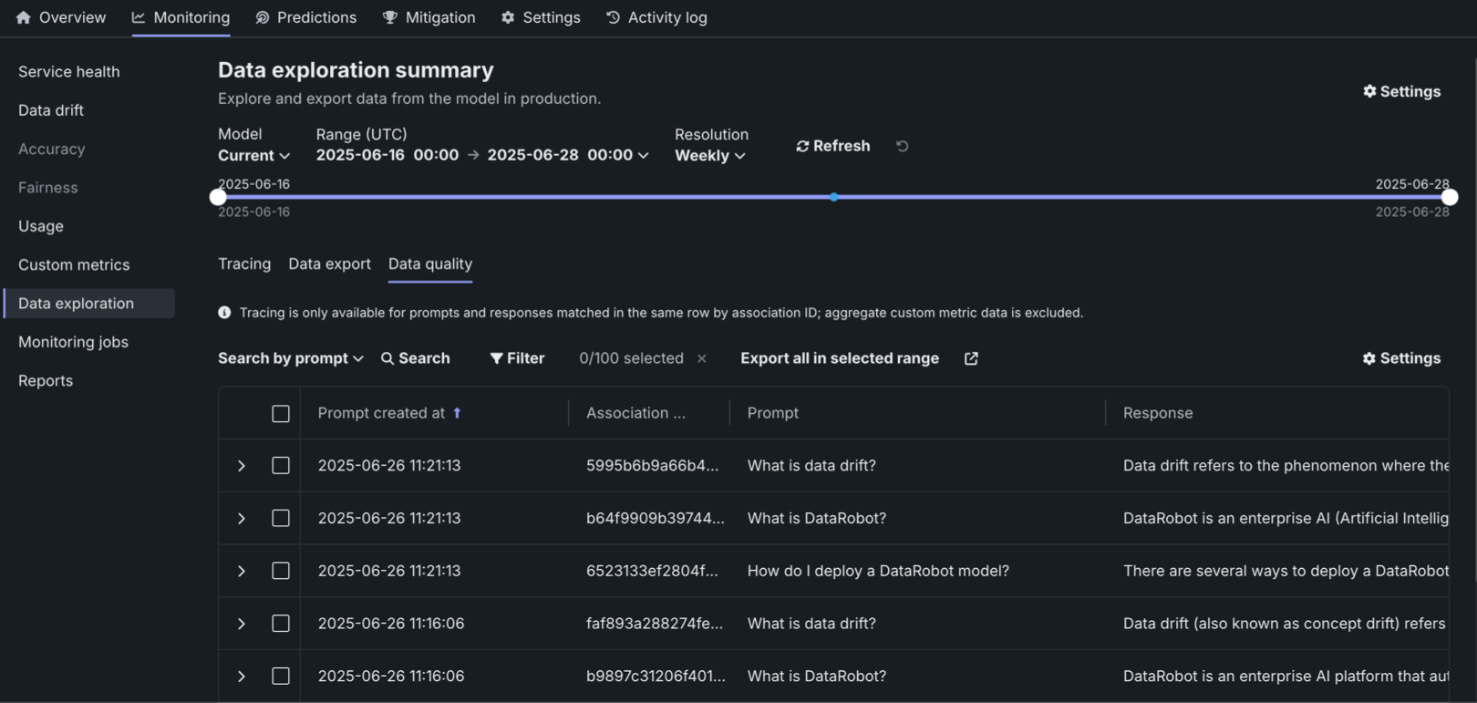 Available as a premium feature, on the Data exploration tab of a Generative AI deployment, click Tracing to explore prompts, responses, user ratings, and custom metrics matched by association ID. This view can provide insight into the quality of the Generative AI model's responses, as rated by users or based on any Generative AI custom metrics you implement. Prompts, responses, and any available metrics are matched by association ID: