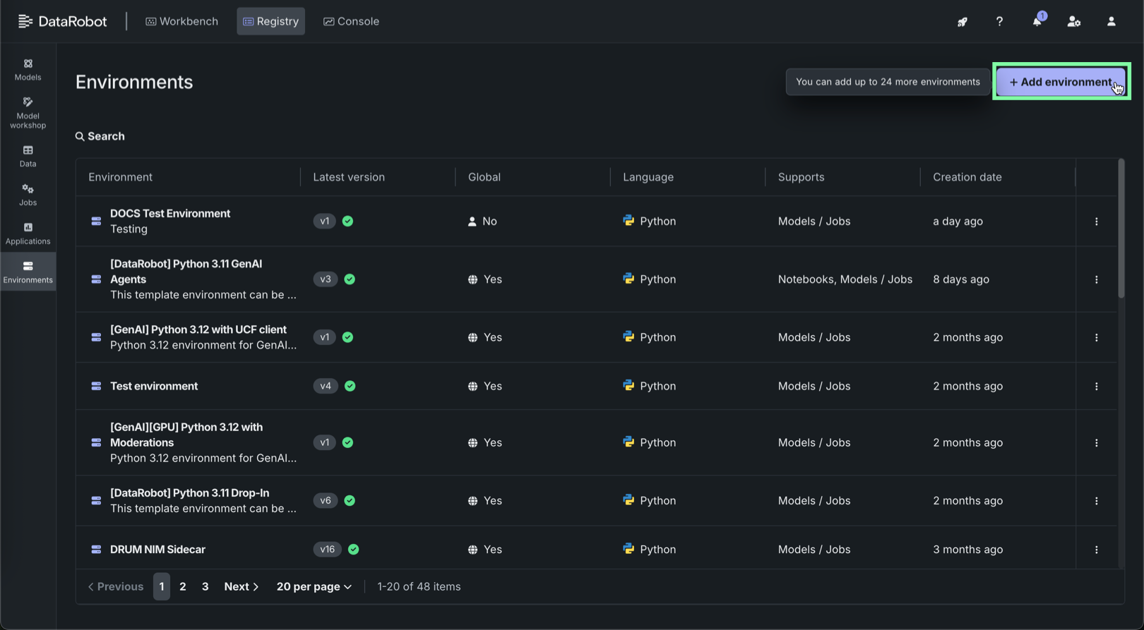 The Environments tab is now available in the NextGen registry, where you can create and manage custom execution environments for your custom models, jobs, applications, and notebooks: