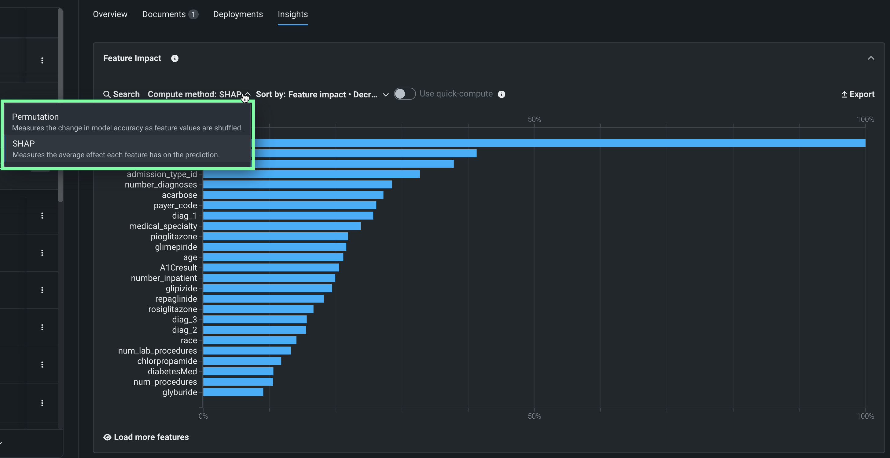 Feature Impact is now available for DataRobot and custom models in the NextGen Registry. On the Insights tab for a registered model version, you can compute Feature Impact using SHAP or permutation importance as a calculation method. This feature provides a high-level visualization that identifies which features are most strongly driving model decisions: