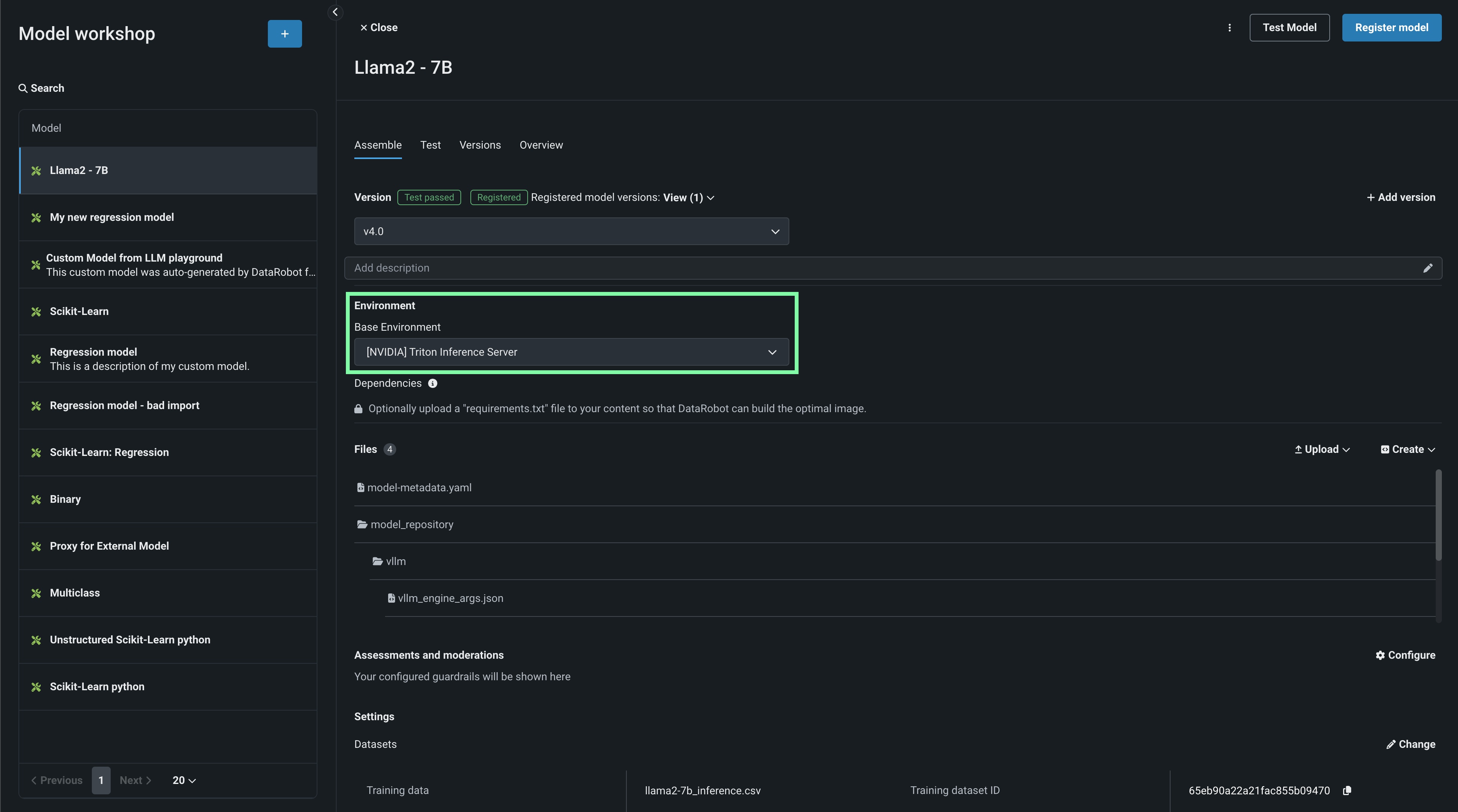 When you create a custom Generative AI model in the NextGen DataRobot Model workshop, you can select an [NVIDIA] Triton Inference Server (vLLM backend) base environment. DataRobot has natively built in the NVIDIA Triton Inference Server to provide extra acceleration for all of your GPU-based models as you build and deploy them onto NVIDIA devices.