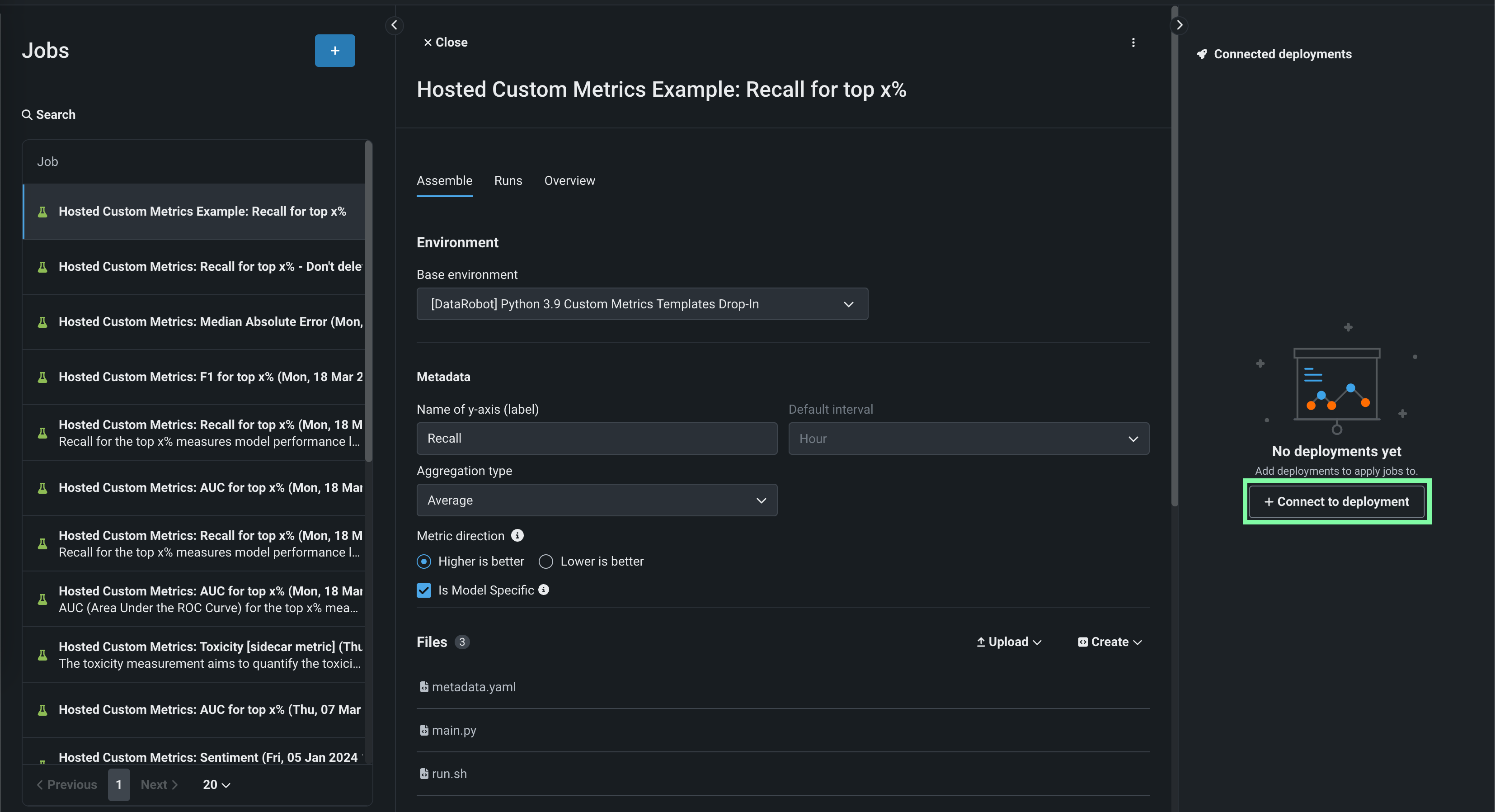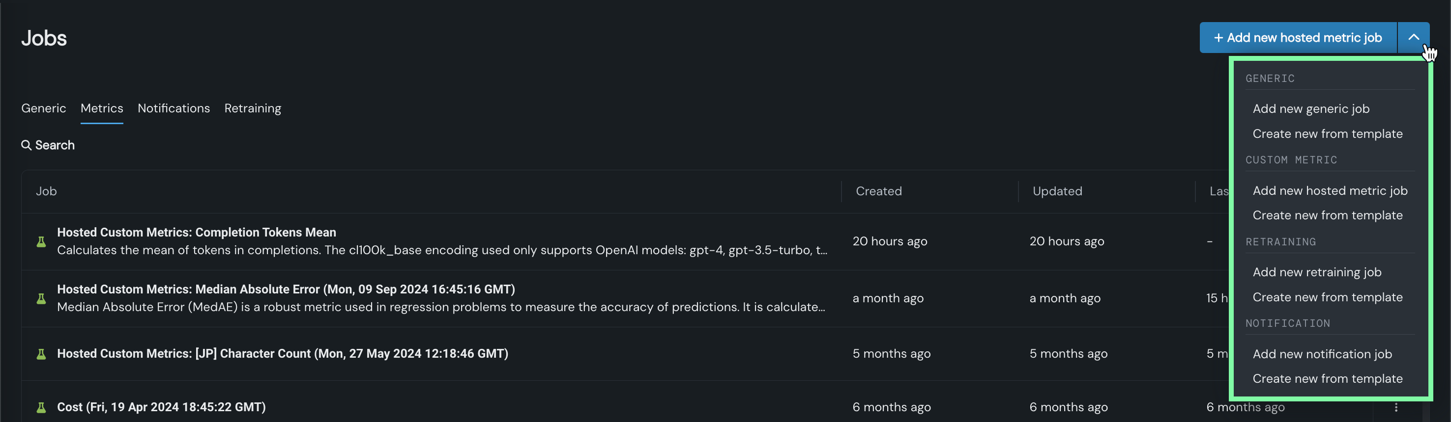 Create new Add a custom job for a new hosted custom metric, defining the custom metric settings and associating the metric with a deployment.