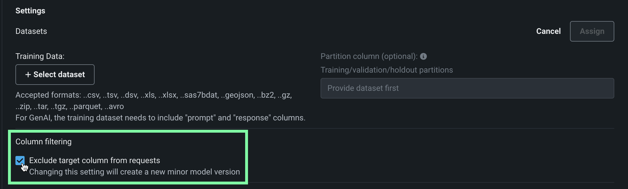 When you assemble a custom model, you can enable or disable column filtering for custom model predictions. The filtering setting you select is applied in the same way during custom model testing and deployment. By default, the target column is filtered out of prediction requests and, if training data is assigned, any additional columns not present in the training dataset are filtered out of any scoring requests sent to the model. Alternatively, if the prediction dataset is missing columns, an error message appears to notify you of the missing features.
