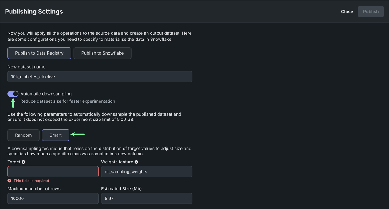 After building a wrangling recipe in Workbench, enable smart downsampling in the publishing settings to reduce the size of your output dataset and optimize model training. Smart downsampling is a data science technique that reduces the time it takes to fit a model without sacrificing accuracy, as well as account for class imbalance by stratifying the sample by class.