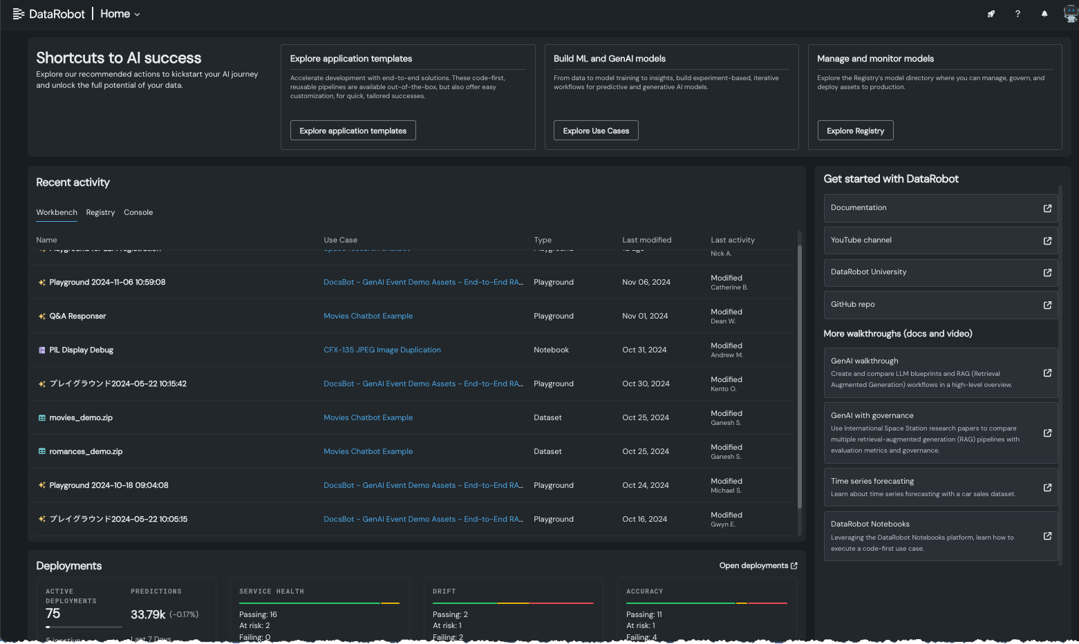 The DataRobot home page, introduced in November of 2023, provides access to a wealth of information for use with the DataRobot app. Responding to user feedback, the new home page has been fine-tuned to provide quick help for new users and access to recent activity for returning users. Use the tiles at the top to quickly access: