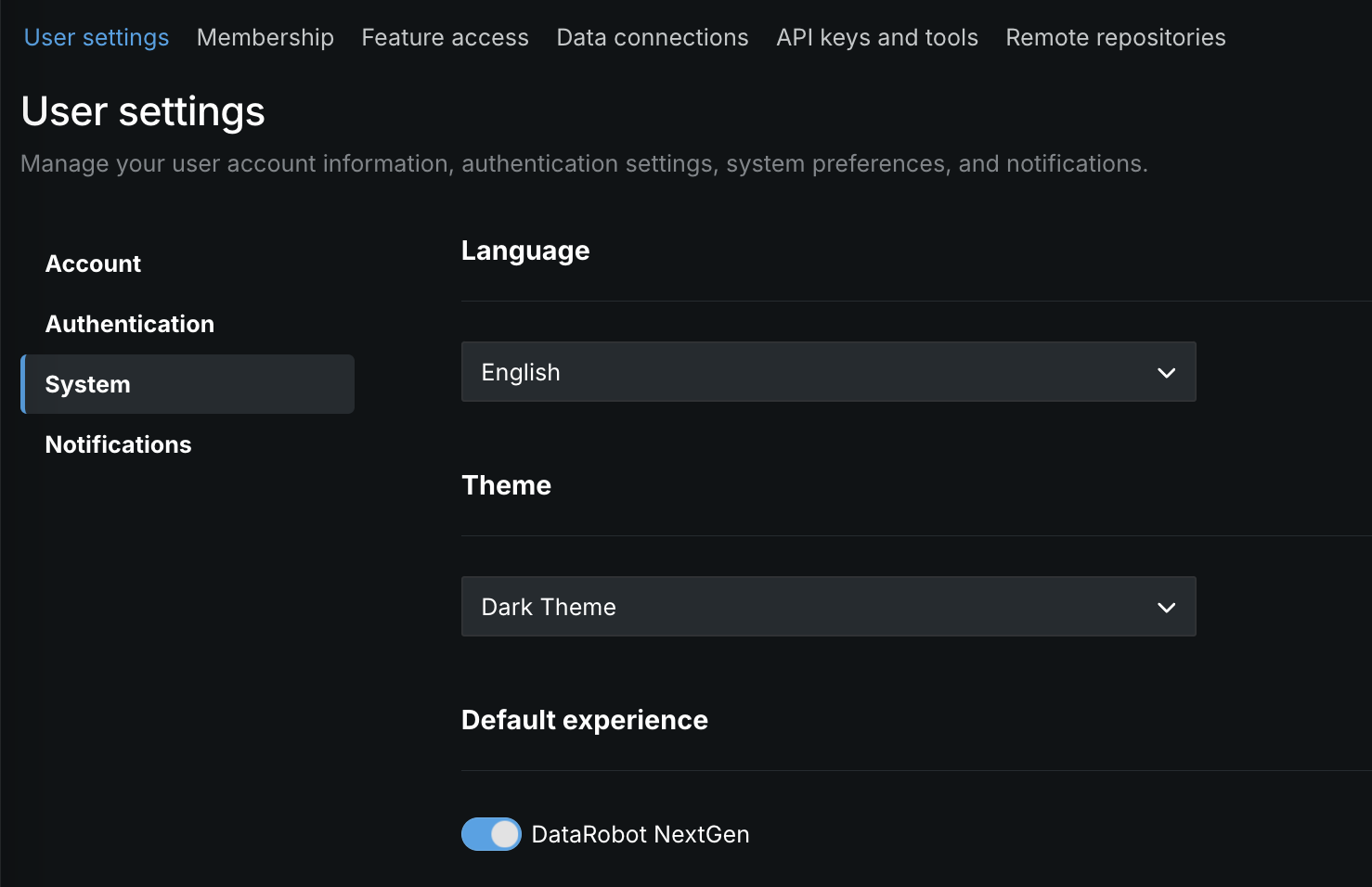 The NextGen homepage is now the default landing page when accessing app.datarobot.com. However, when you request a specific page, for example app.datarobot.com/projects/123abc/models, you will be brought to the requested page. You can make DataRobot Classic the default page instead of NextGen by selecting User settings > System and disabling the toggle.