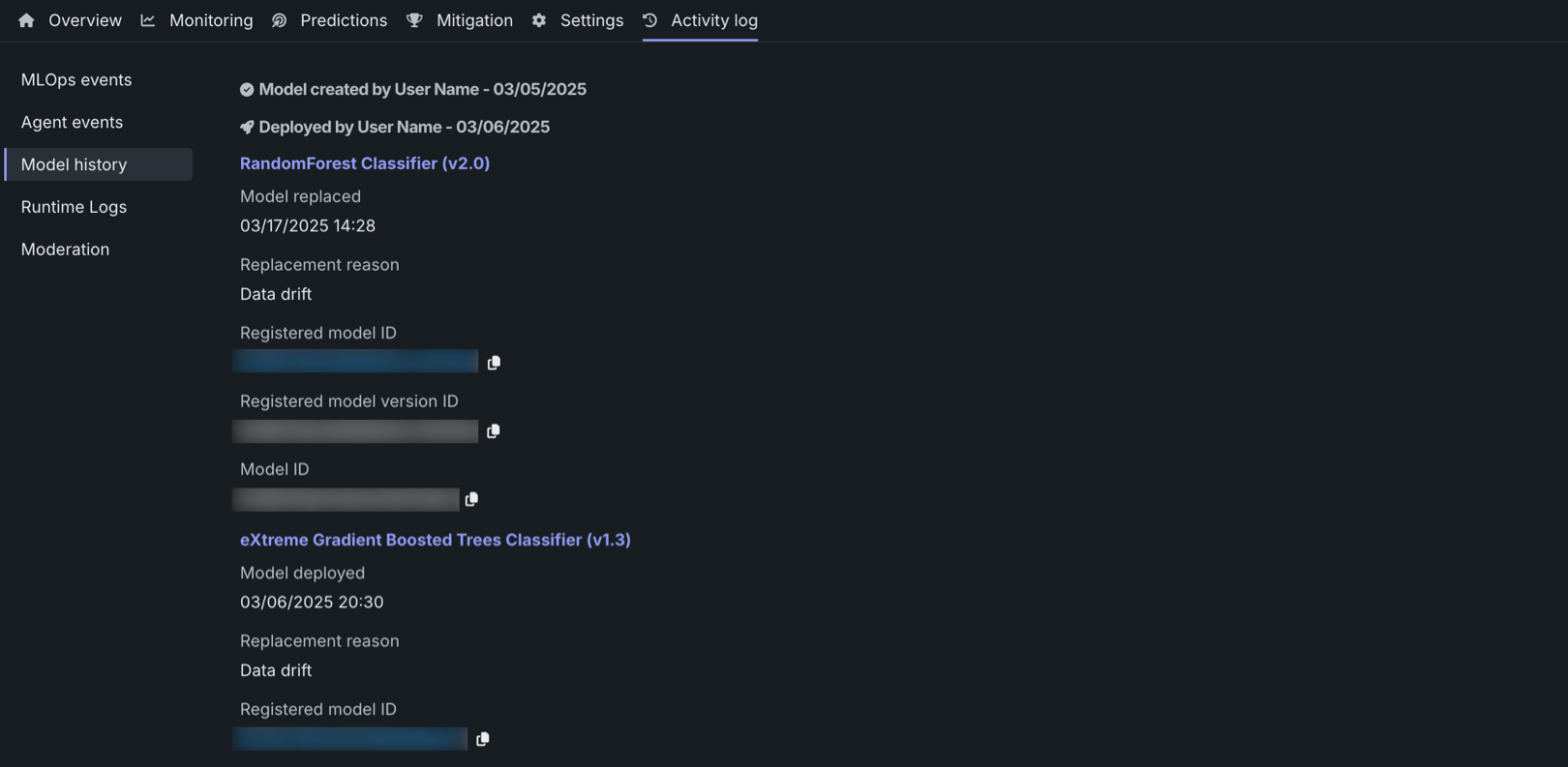 Tracking deployment events on a deployment's Activity log > Model history tab is essential when a deployed model supports a critical use case. You can maintain deployment stability by monitoring a model's history through this event log. These events include when the model was deployed or replaced. The deployment history links these events to the user responsible for the change. Each model replacement event reports the replacement date and justification (if provided). In addition, you can find and copy the model IDs of any previously deployed model, or you can click a registered model ID to open the model in Registry (if you have access).