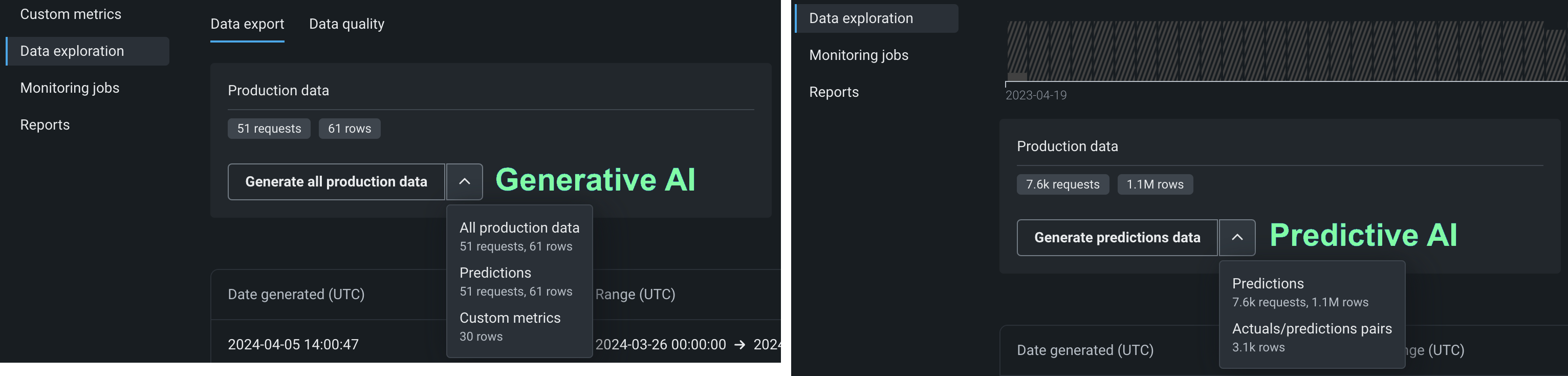 | All production data | For generative AI deployments, generate all available production data (predictions, actuals, custom metrics) for the specified model and time range. |