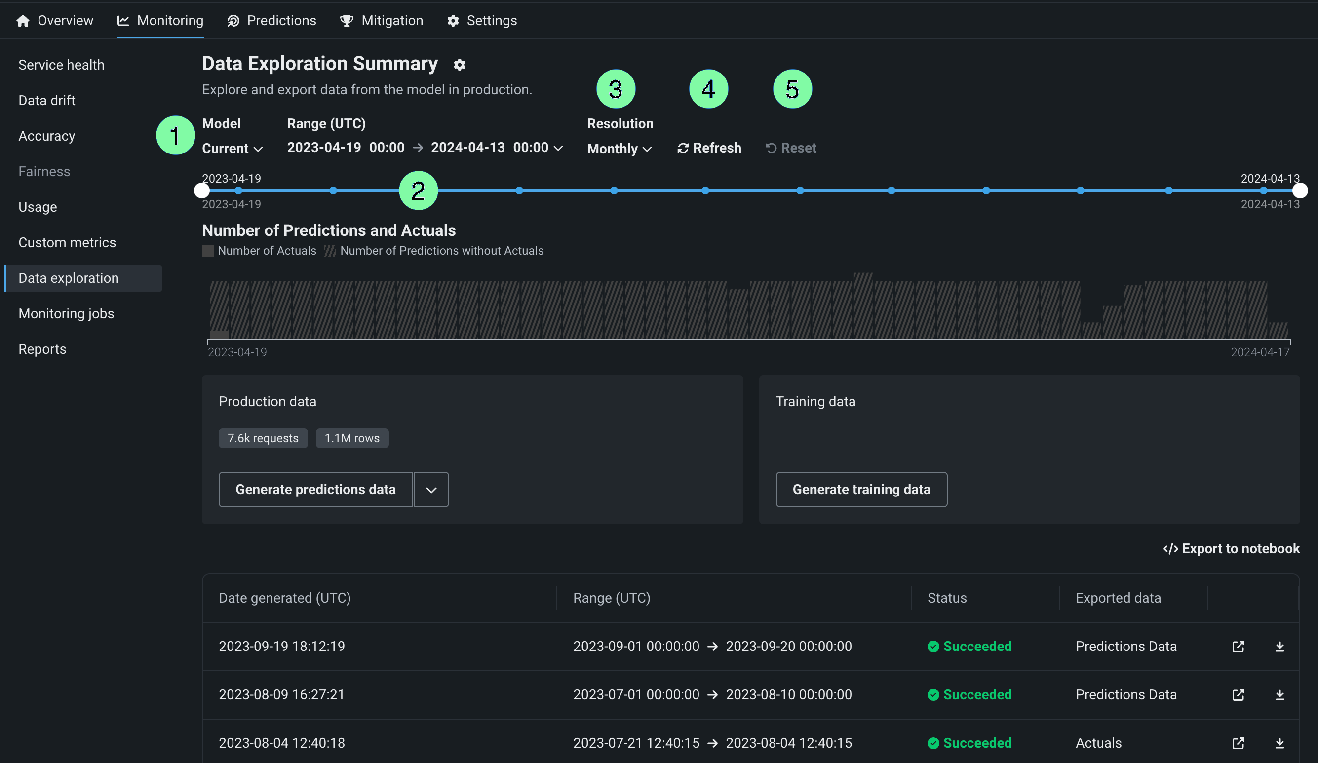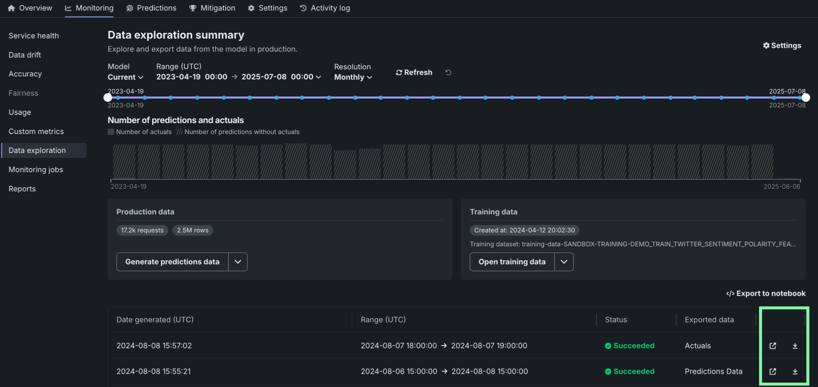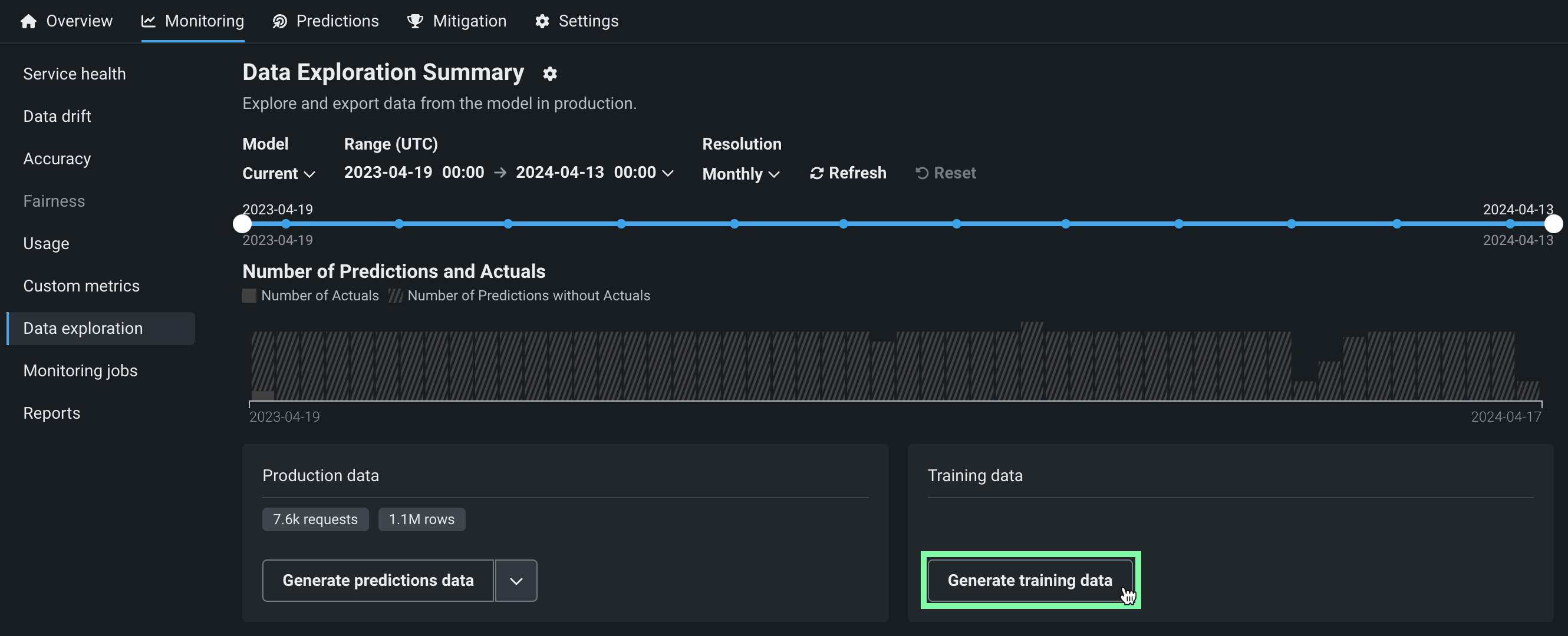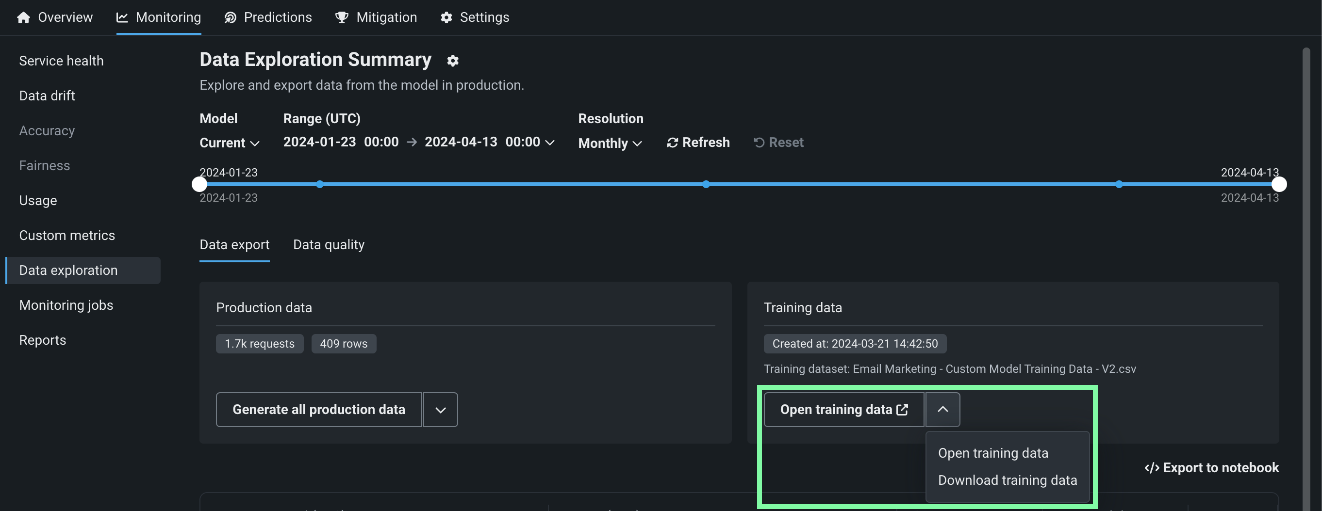 To access deployment data export for training data, on the Data exploration summary page, locate the Training data panel and click Generate training data to generate data for the specified model and time range:
