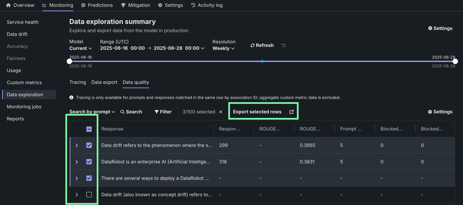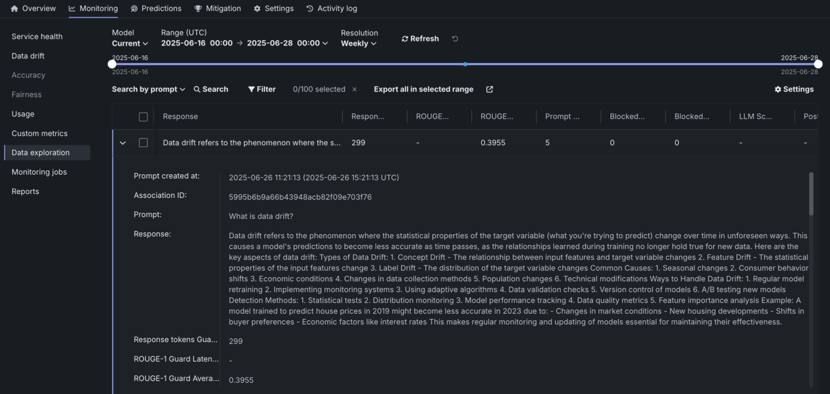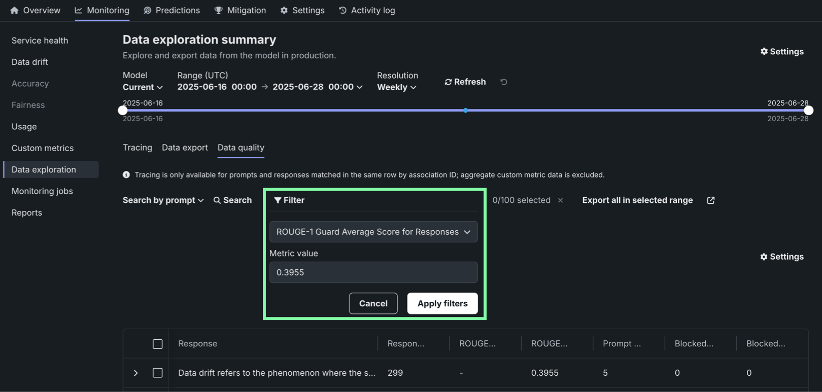 On the Data exploration tab of a generative AI deployment, click Data quality to explore prompts and responses alongside user ratings and custom metrics, if implemented, providing insight into the quality of the generative AI model. Prompts, responses, and any available metrics are matched by association ID: