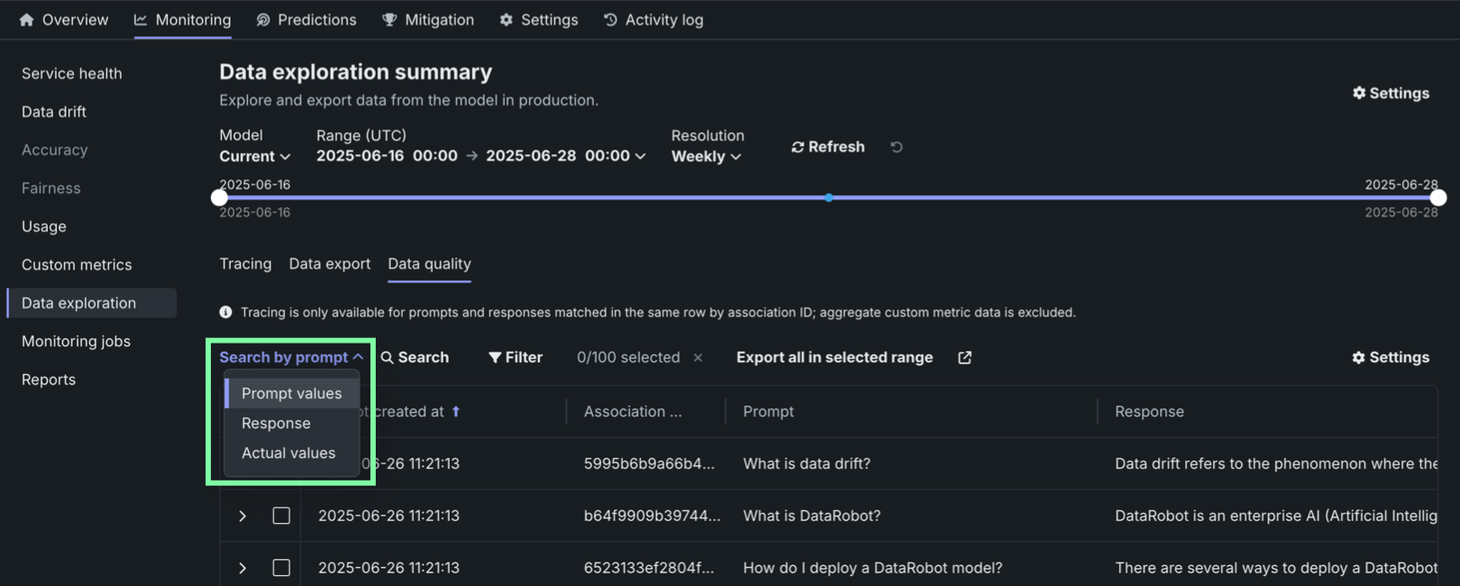 To use the data quality table, define an association ID to match prompts with responses in the same row. Tracing analysis is only available for prompts and responses matched in the same row by association ID; aggregate custom metric data is excluded.