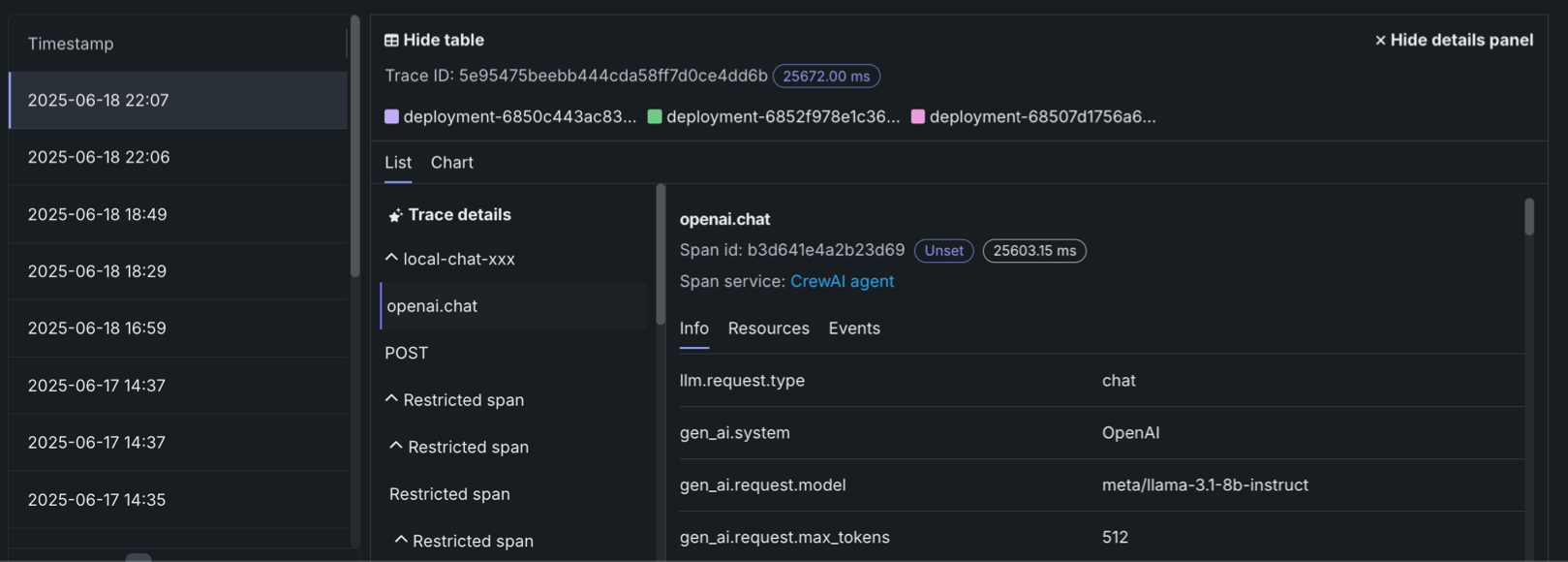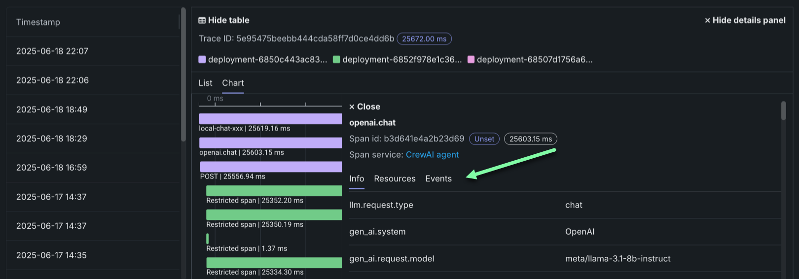 For either view, click the Span service name to access the deployment or resource (if you have access). Additional information, dependent on the configuration of the generative AI model or agentic workflow, is available on the Info, Resources, Events, and Errors tabs. The Errors tab only appears when an error occurs in a trace.