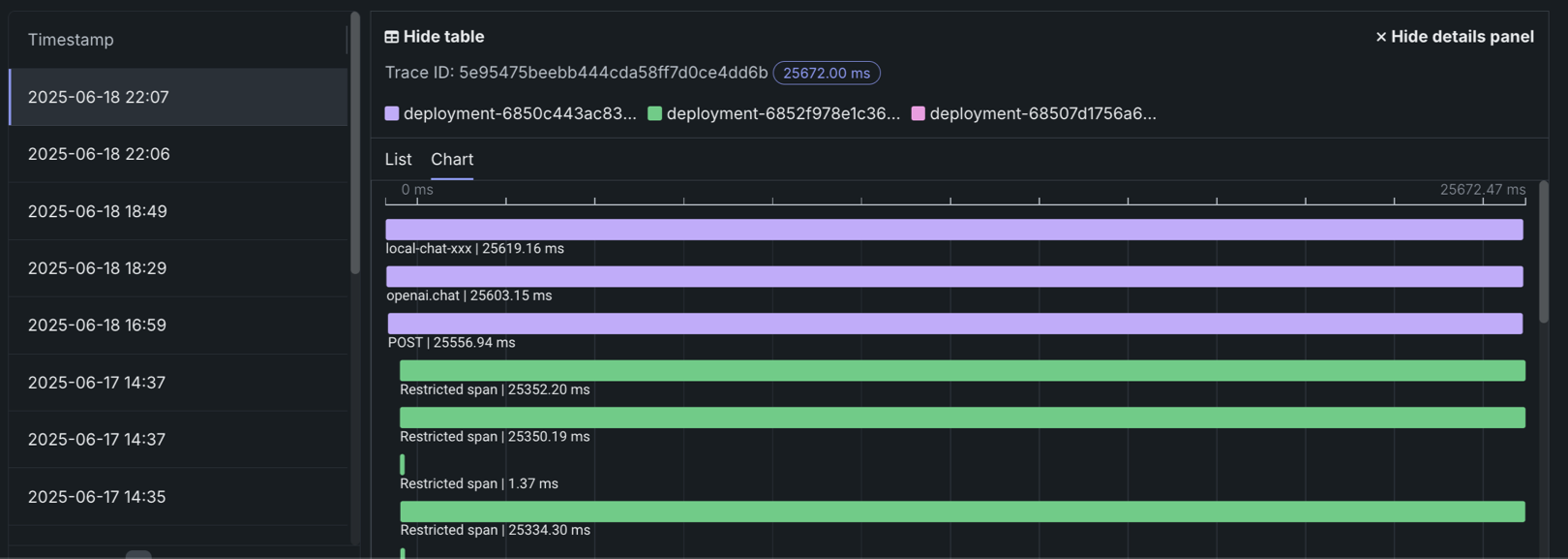 To review the spans contained in a trace, along with trace details, click a trace row in the Tracing table. The span colors correspond to a Span service, usually a deployment. Restricted span appears when you don’t have access to the deployment or service associated with the span. You can view spans in Chart format or List format.