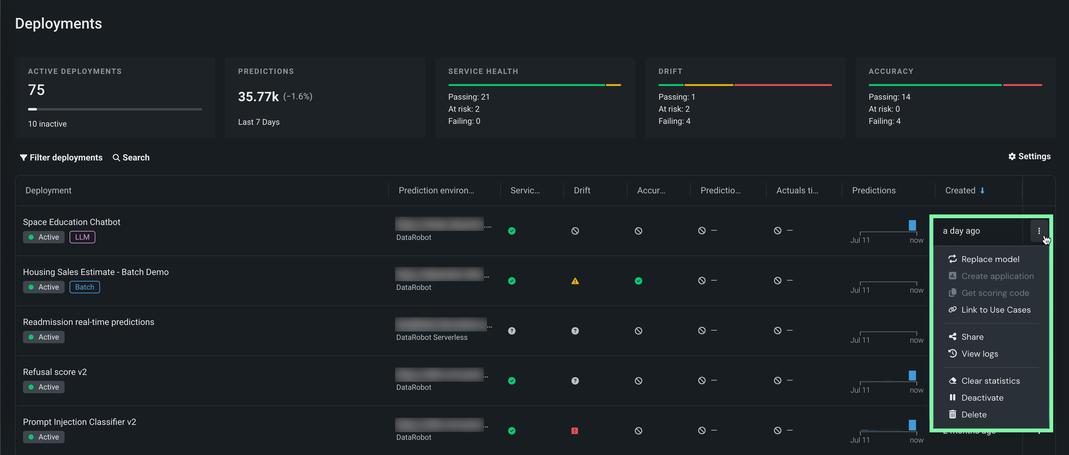 Or, click the row in the table to open the deployment Overview, where you can view deployment information and access the actions menu.