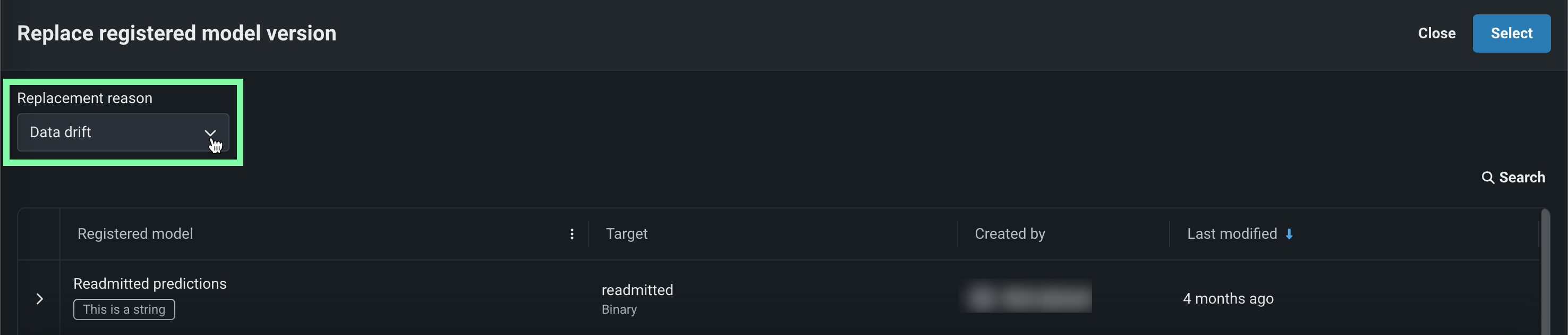| Replace model | Owner | Replaces the current model in the deployment with a newly specified registered model version. Prediction accuracy tends to degrade over time (which you can track in the Data drift dashboard) as conditions and data change. If you have the appropriate permissions, you can easily switch over to a new, better-adapted model using the model replacement action. You can then incorporate the new model predictions into downstream applications. This action initiates an email notification. |