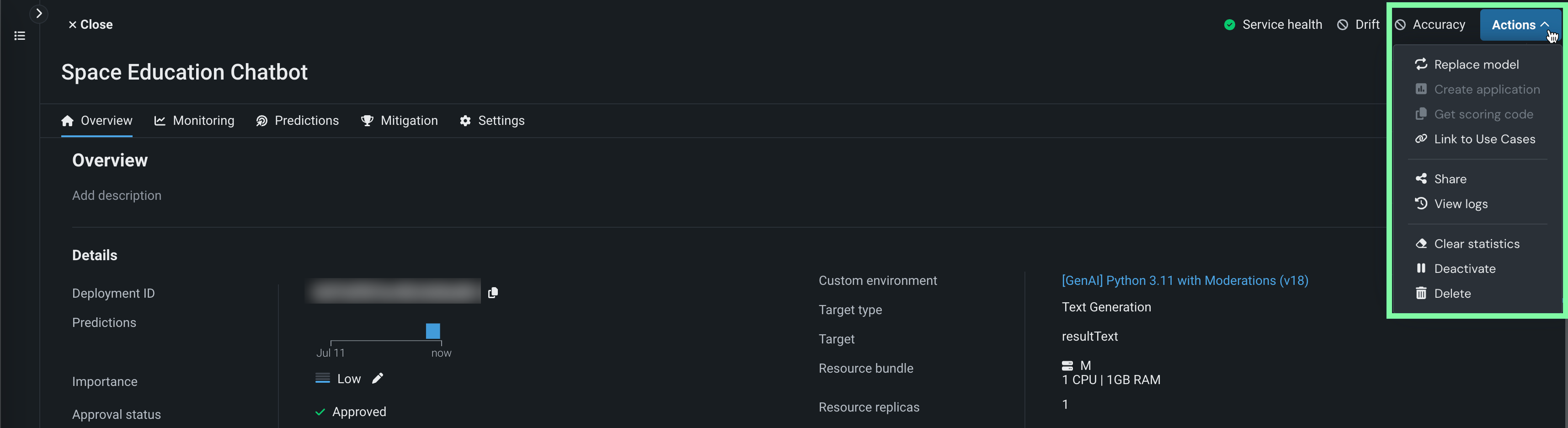 | View logs | User, Owner | For custom model deployments, opens the custom model runtime and startup logs for troubleshooting. For more information, see the Runtime logs documentation. |