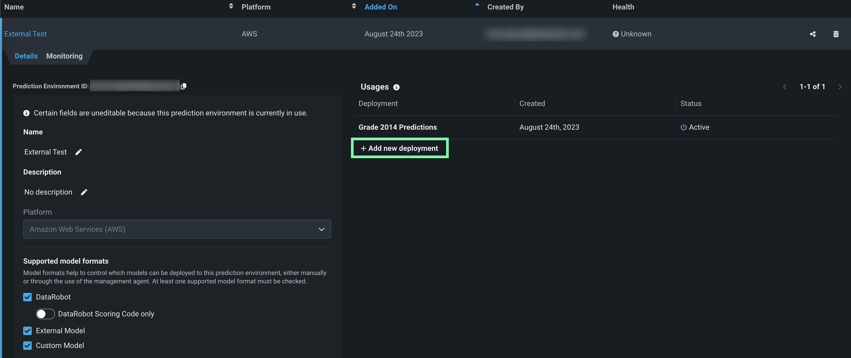 From the Prediction environments page, you can deploy a model directly to any prediction environment, DataRobot or external.