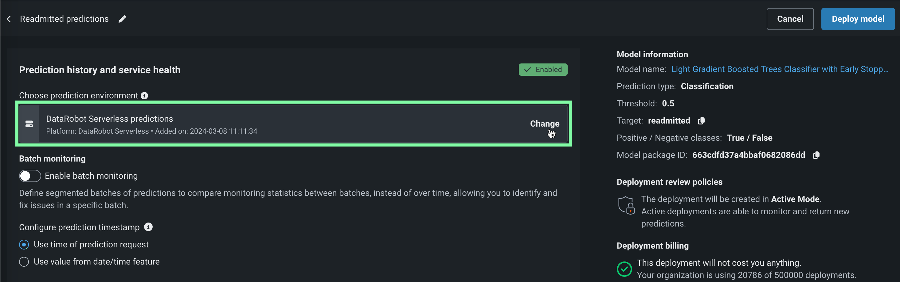 In the Prediction history and service health settings, under Choose prediction environment, click Change.