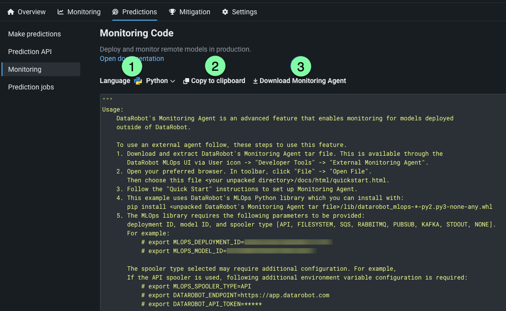 | 1 | Language | Select the Language for the monitoring code snippet. To monitor Scoring Code with a deployment, select the Java language and copy the snippet to your clipboard. For further instructions, reference the monitoring agent's internal documentation. |