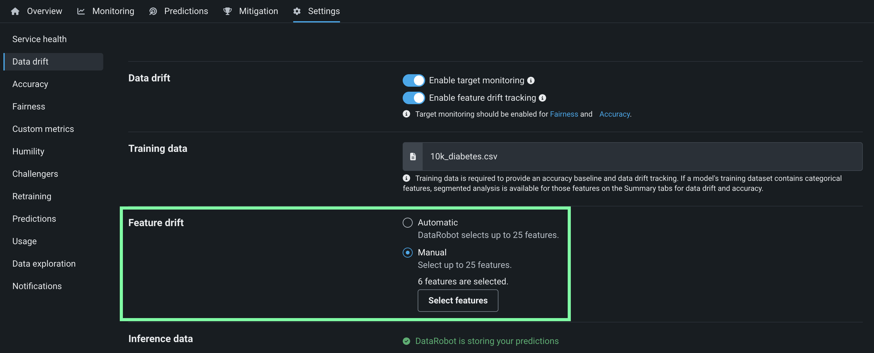Enable feature drift tracking Configures DataRobot to track feature drift in a deployment. Training data is required for feature drift tracking.
