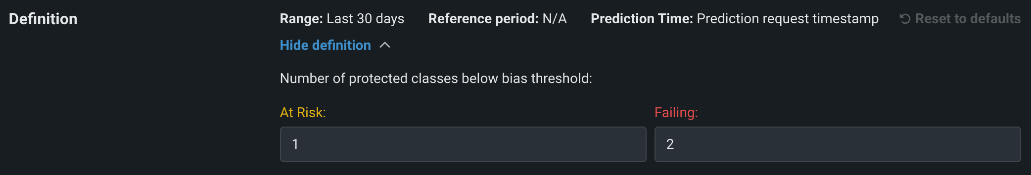 Failing Defines the number of protected features below the bias threshold that, when exceeded, classifies the deployment as "Failing" and triggers notifications. The threshold for Failing should be higher than the threshold for At Risk.
