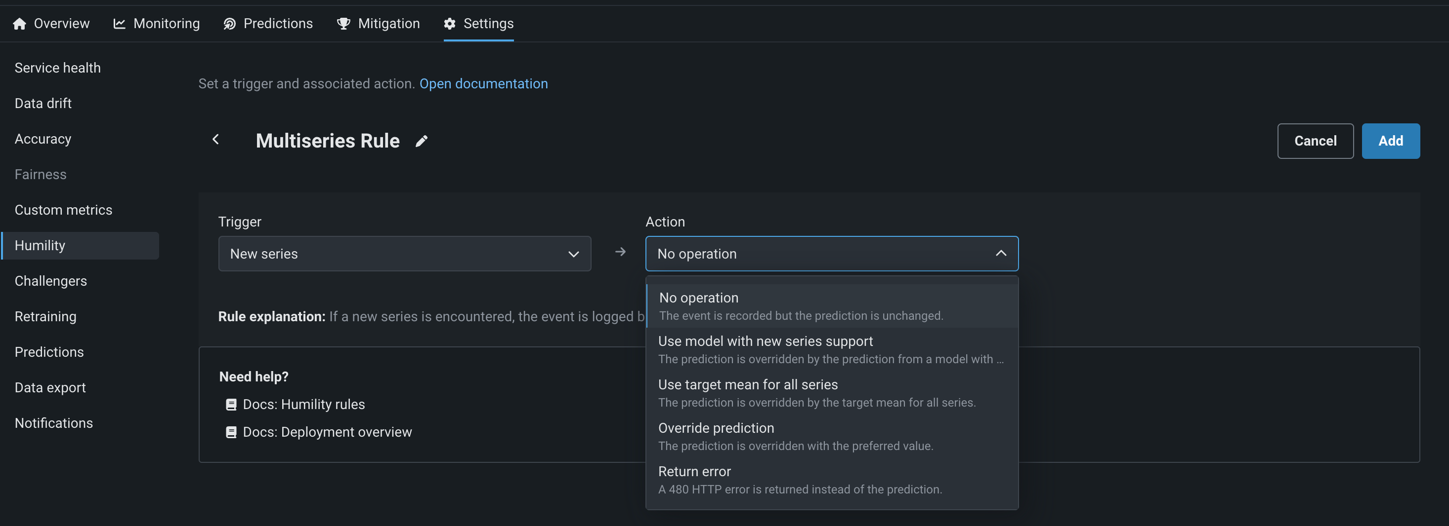 MLOps allows you to create humility rules for deployments on the Settings > Humility tab. Humility rules enable models to recognize, in real time, when they make uncertain predictions or receive data they have not seen before. Unlike data drift, model humility does not deal with broad statistical properties over time—it is instead triggered for individual predictions, allowing you to set desired behaviors with rules that depend on different triggers. Using humility rules to add triggers and corresponding actions to a prediction helps mitigate risk for models in production. Humility rules help to identify and handle data integrity issues during monitoring and to better identify the root cause of unstable predictions.