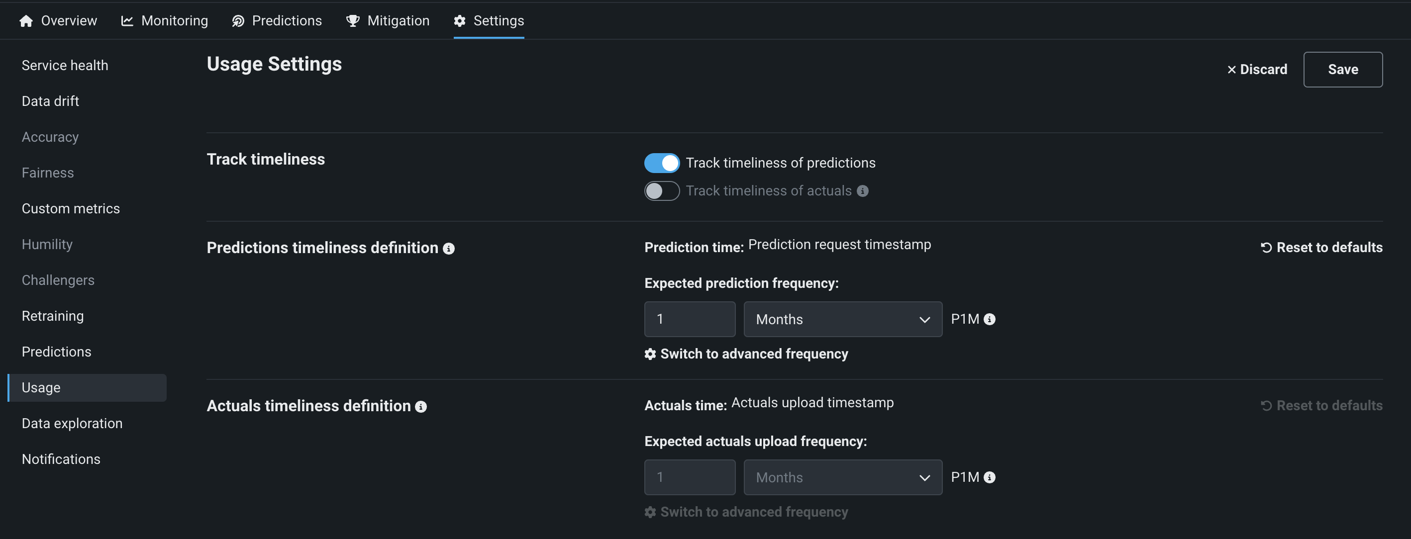 Timeliness indicators show if the prediction or actuals upload frequency meets the standards set by your organization. Configure timeliness tracking for predictions and actuals on the Settings > Usage tab. After enabling tracking, you can define the timeliness interval frequency based on the prediction timestamp and the actuals upload time separately, depending on your organization's needs. If timeliness is enabled for a deployment, the health indicators retain the most recently calculated health status, presented along with timeliness status indicators to reveal when they are based on old data. You can determine the appropriate timeliness intervals for your deployments on a case-by-case basis.