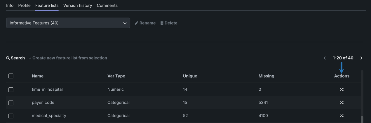 | 4 | + Create new feature list from selection | Create a new feature list from the features that are currently selected. |