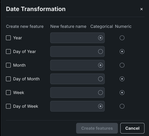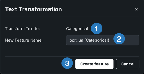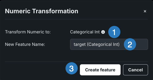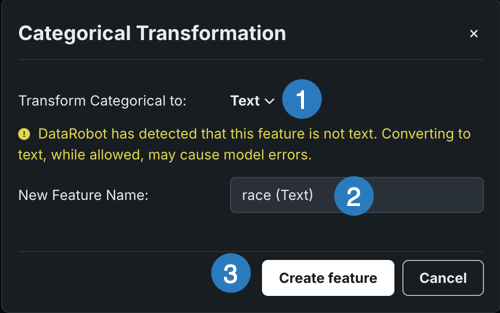 | 2 | New feature name | Provides a field to rename the new feature. By default, DataRobot uses the existing feature name with the new variable type appended. |