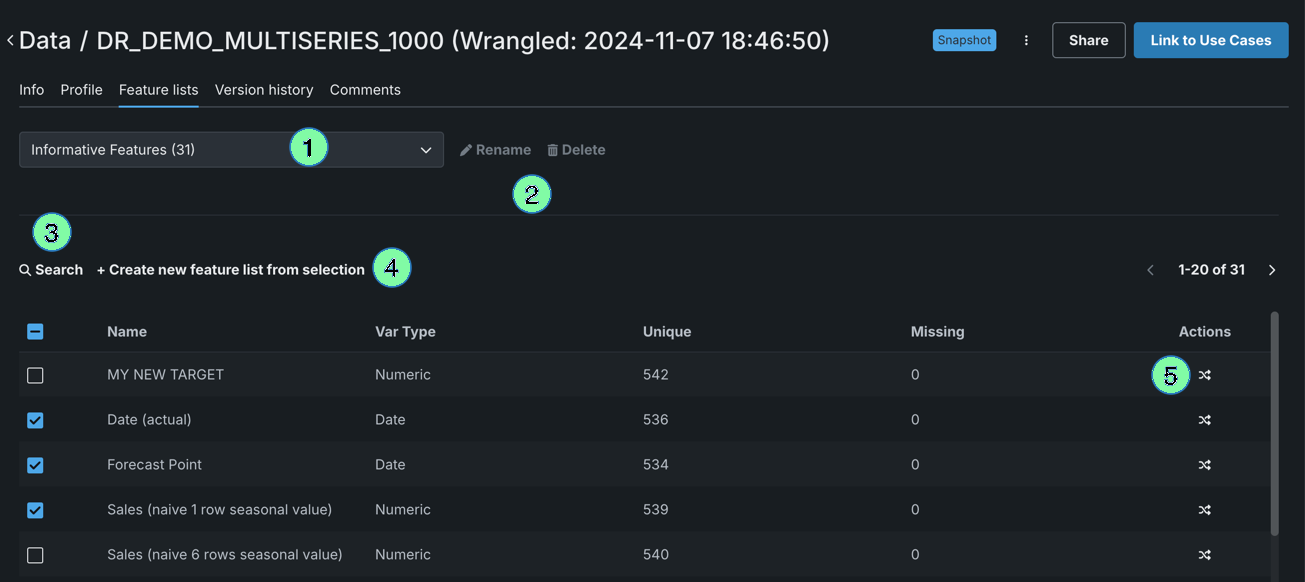 | 2 | Rename / Delete | Rename or Delete the custom feature list selected in the feature list dropdown. You cannot make any changes to DataRobot default feature lists. |