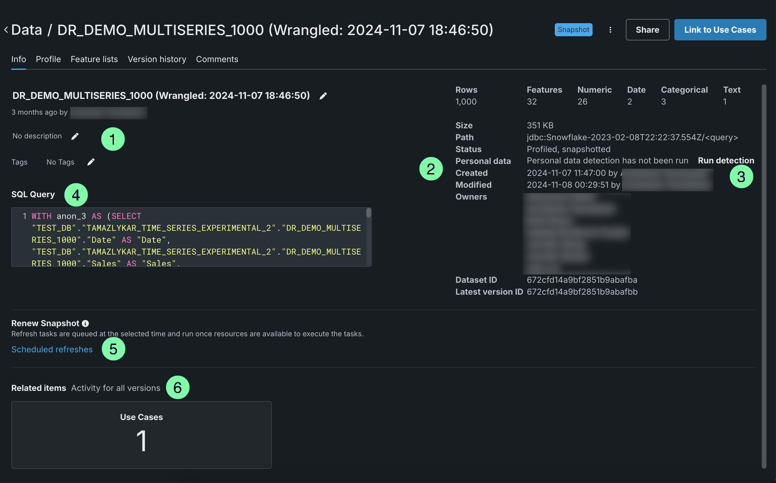 | 2 | Dataset version information | Displays the number of rows and features display on the right, along with other details for the individual dataset version. |