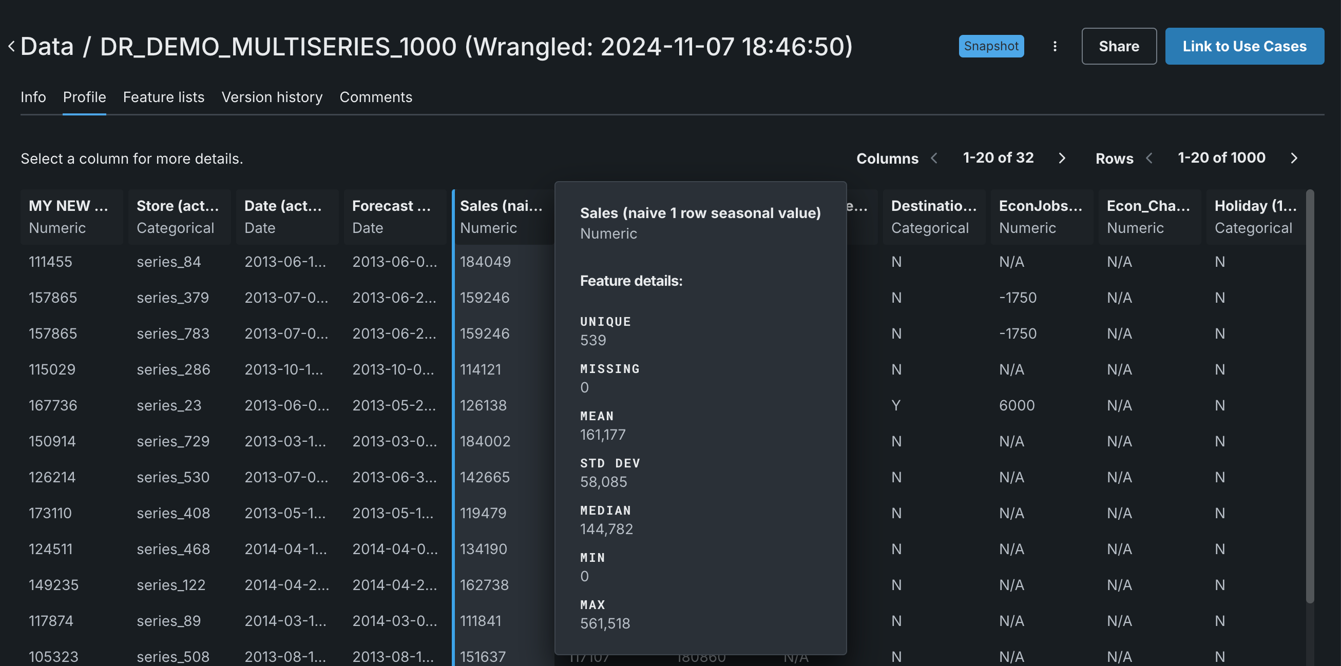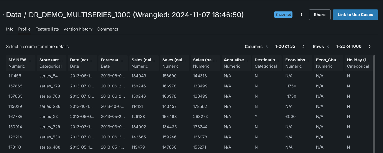 | 2 | Dataset information | Displays the number of rows and features display on the right, along with other details. |