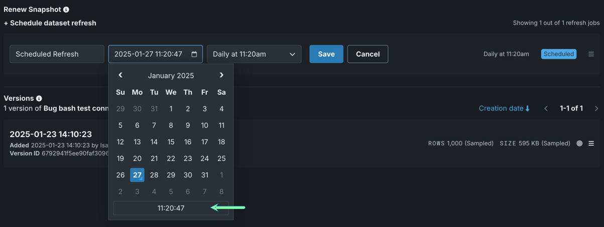 Click in the time picker. Use the arrows to change the time, setting the timestamp to the local time at which you want the snapshot to refresh. Click on the date to return to the full calendar view: